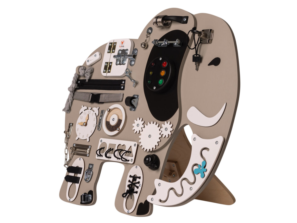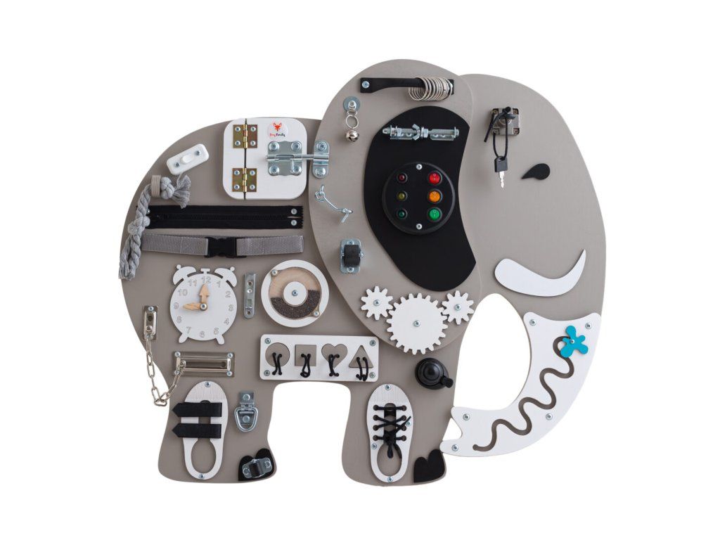 Montessori activity board Safari Slon Kostek je hračka a vzdělávací pomůcka pro batolata a malé děti. Deska obsahuje spoustu zábavných prvků, které může dítko objevit a prozkoumat. Jak už to tak bývá, děti se nejvíce zabaví s dospěláckými předměty a přesně proto si náš activity board okamžitě zamilují!