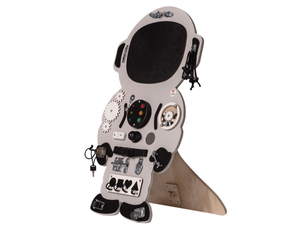 Deska kosmonaut se skládá z 19 prvků: LED lampa/semafor, ozubená kolečka, háček na okno, zámek, struny se zátkami, různé druhy zvonků, klepadlo, kalkulačka, zrcadlo, pásek se sponou, tyč se šrouby, různé druhy koleček, vypínač, třídič, křídová tabule a další!