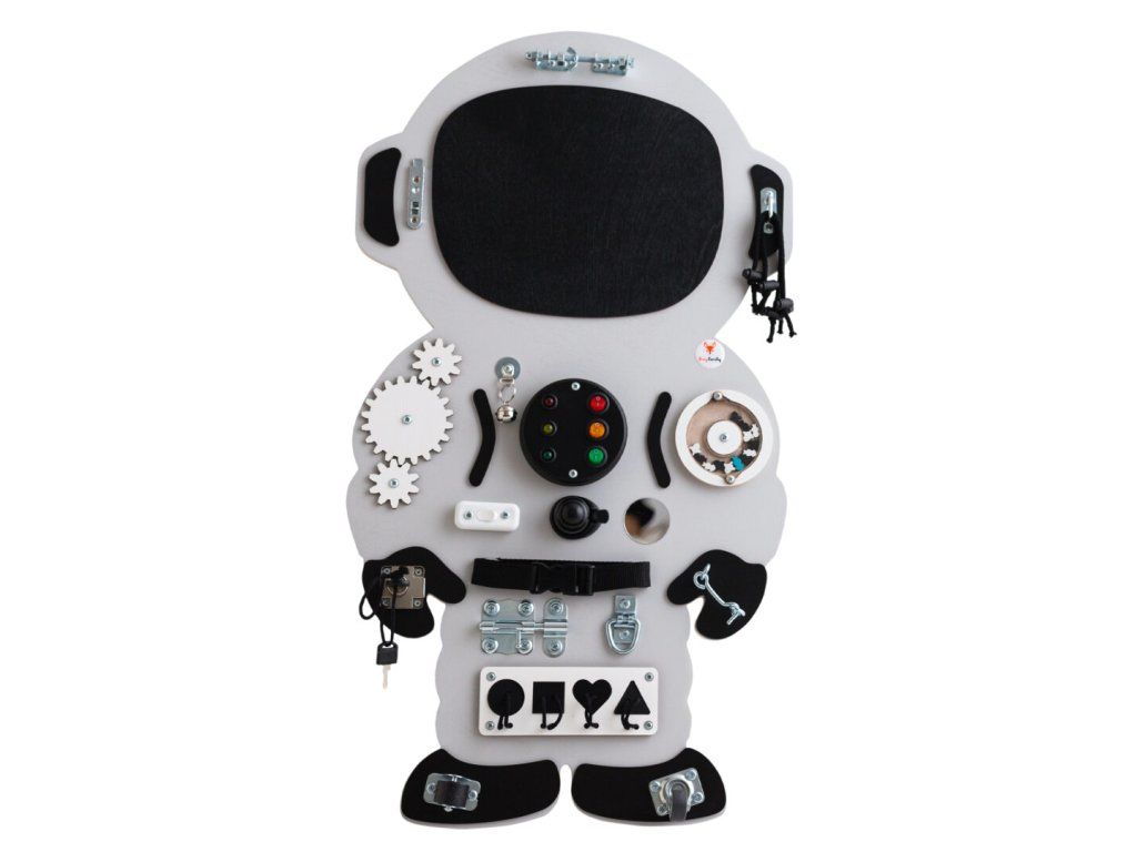 Montessori activity board Spaceland Kosmonaut je hračka a vzdělávací pomůcka pro batolata a malé děti. Deska obsahuje spoustu zábavných prvků, které může dítko objevit a prozkoumat. Jak už to tak bývá, děti se nejvíce zabaví s dospěláckými předměty a přesně proto si náš activity board okamžitě zamilují!