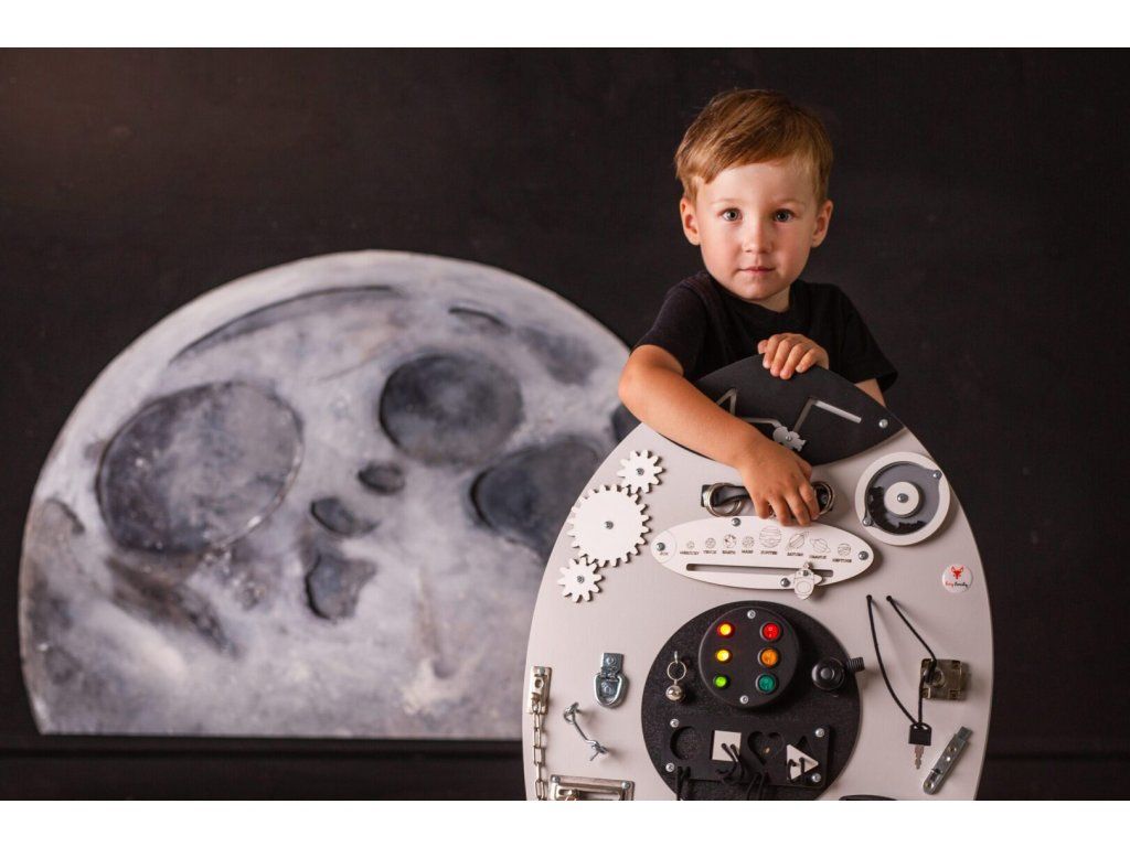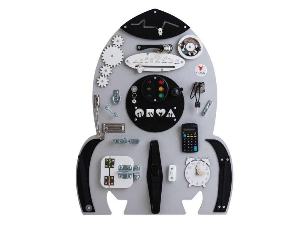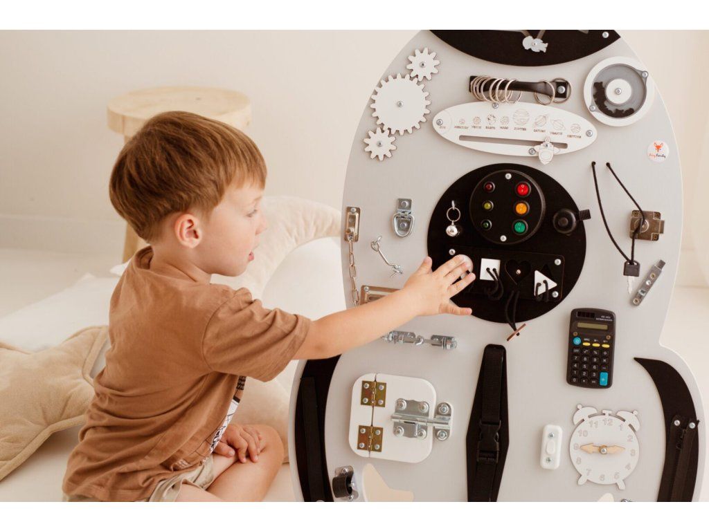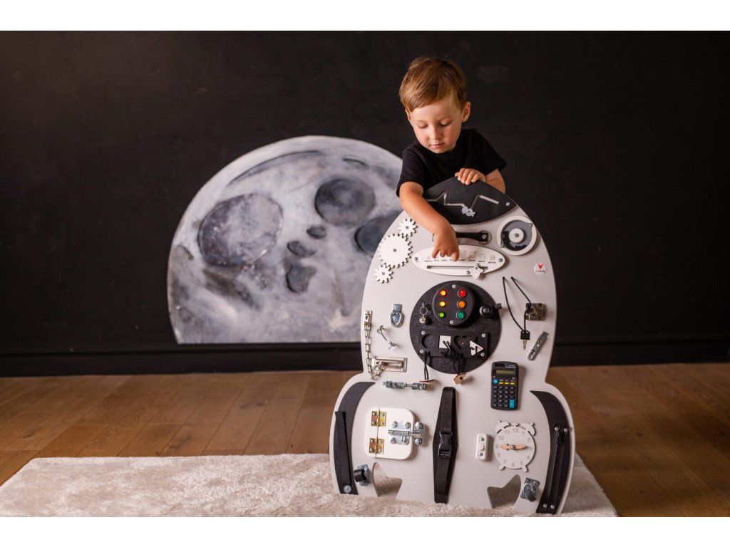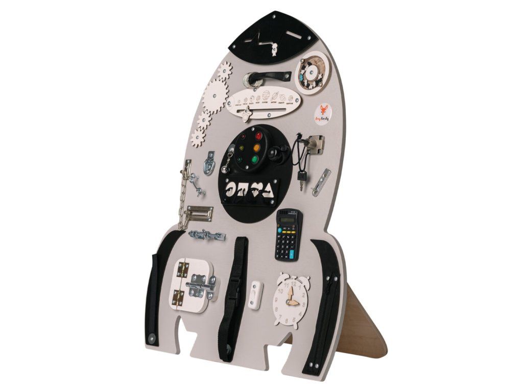 Montessori activity board Spaceland Raketa je hračka a vzdělávací pomůcka pro batolata a malé děti. Deska obsahuje spoustu zábavných prvků, které může dítko objevit a prozkoumat. Jak už to tak bývá, děti se nejvíce zabaví s dospěláckými předměty a přesně proto si náš activity board okamžitě zamilují!