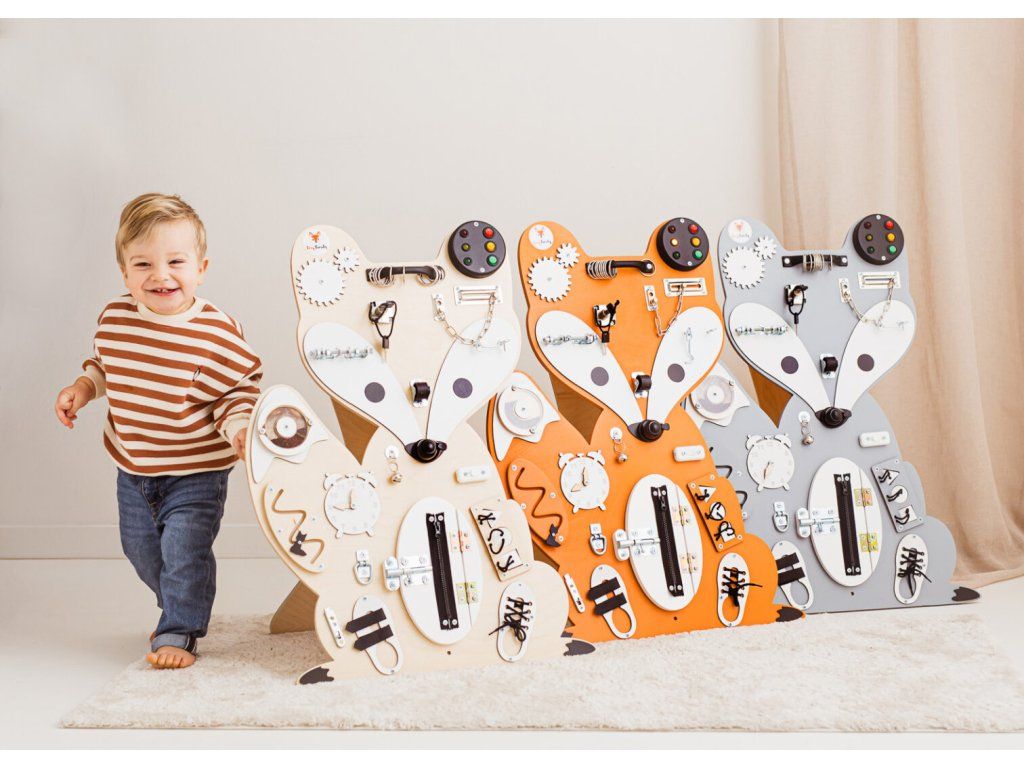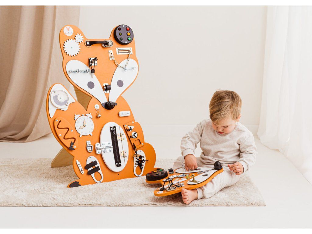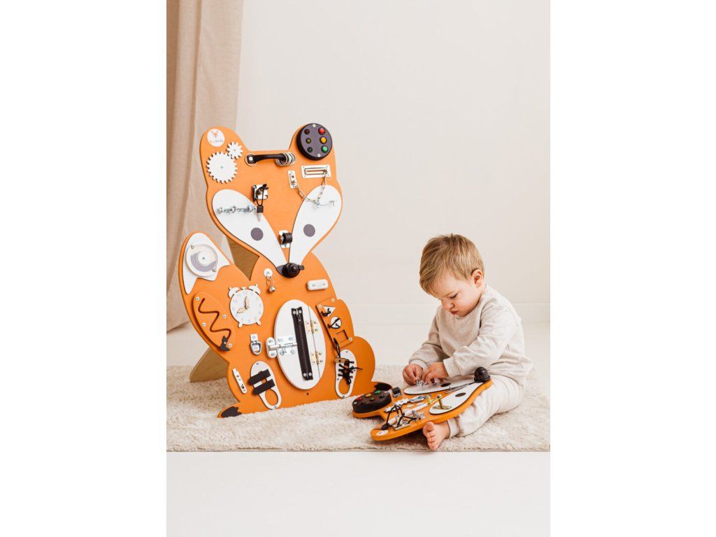 Montessori activity board Woodland LišákHubert je hračka a vzdělávací pomůcka pro batolata a malé děti. Deska obsahuje spoustu zábavných prvků, které může dítko objevit a prozkoumat. Jak už to tak bývá, děti se nejvíce zabaví s dospěláckými předměty a přesně proto si náš activity board okamžitě zamilují!