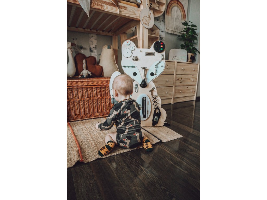 Montessori activity board Woodland LišákHubert je hračka a vzdělávací pomůcka pro batolata a malé děti. Deska obsahuje spoustu zábavných prvků, které může dítko objevit a prozkoumat. Jak už to tak bývá, děti se nejvíce zabaví s dospěláckými předměty a přesně proto si náš activity board okamžitě zamilují!