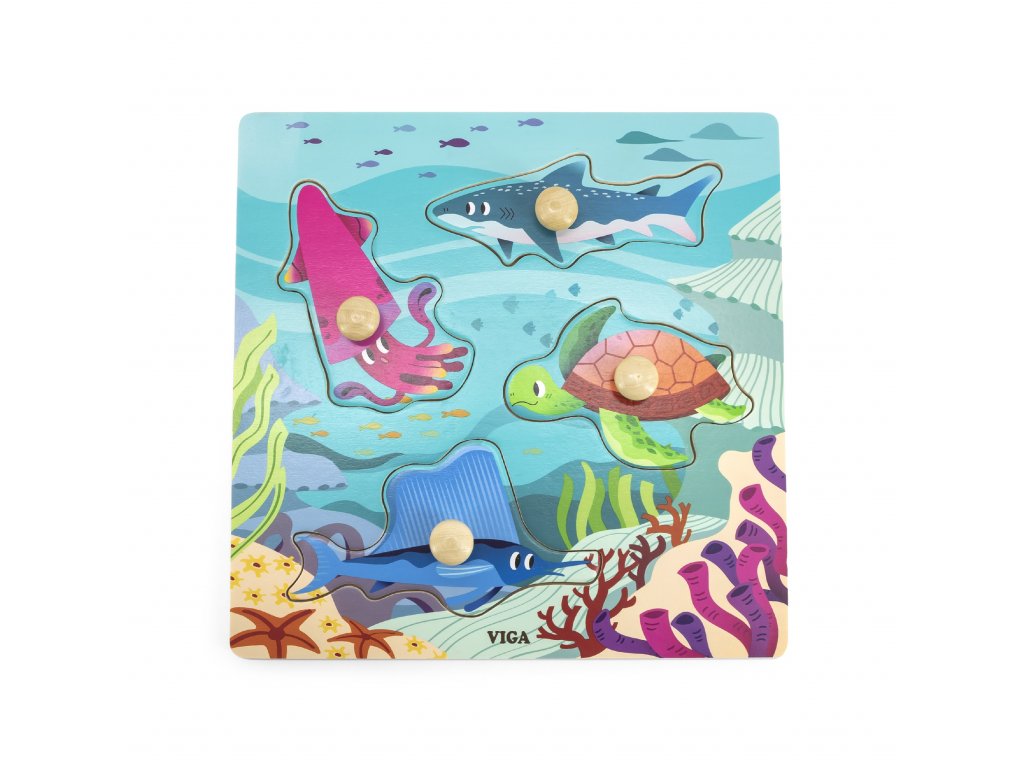 Dřevěné puzzle s odznaky od Viga pro děti jsou perfektním řešením pro domácnost i školku. Skládá se z desky a 4 tématických prvků. Na dřevěné základně jsou prohlubně, které odpovídají tvaru barevných dílků puzzle.