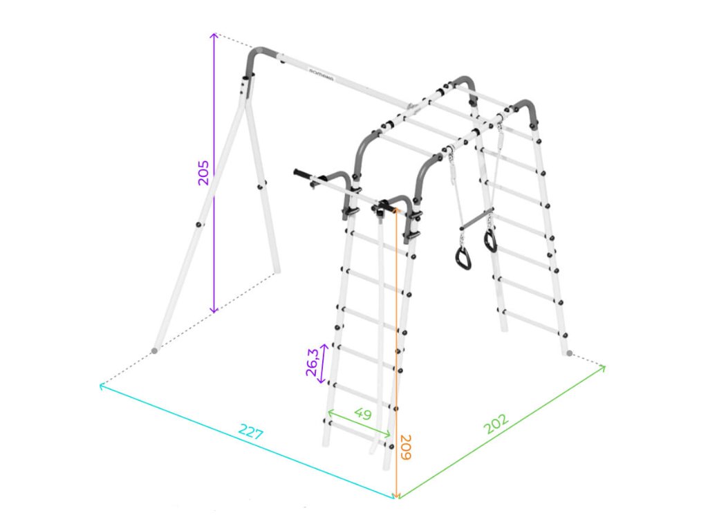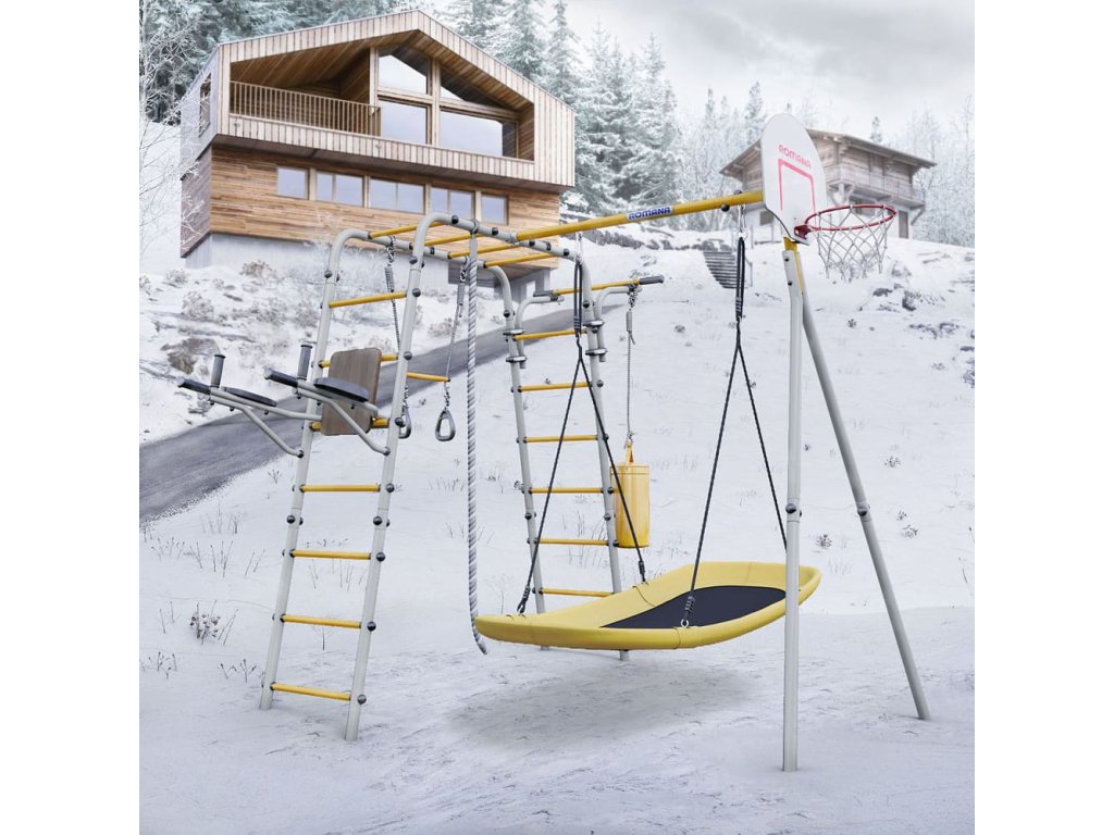 Toto zahradní hřiště obsahuje mimo jiné výškově nastavitelnou hrazdu, vodorovný žebřík, gymnastické lano a gymnastické kruhy s hrazdou. Všechny tyto prvky jsou ideální pro provádění gymnastických cviků.