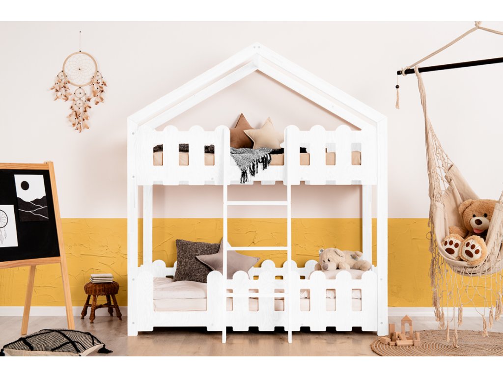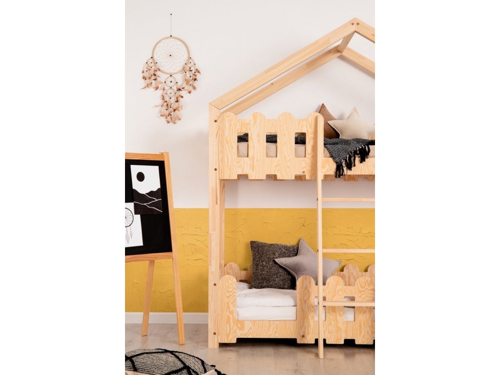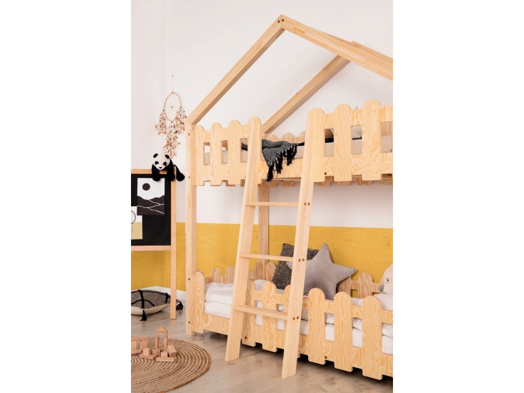 Domečková patrová dětská postel z masivního dřeva s krásným plotem se stane absolutní hvězdou dětského pokoje vašich dětí. Ve dne ji využijí pro hraní, stavění bunkrů, zámků pro princezny a nedobytných pevností. V noci bude klidným a bezpečným útočištěm pro ty nejkrásnější sny vašich andílků.