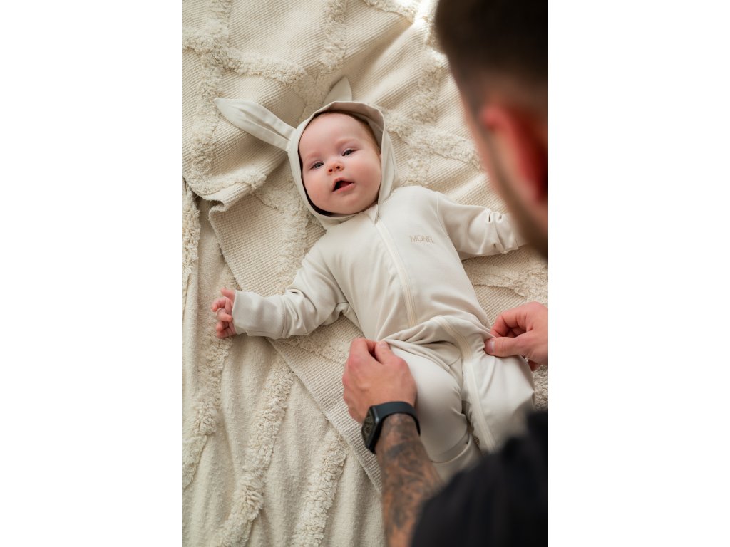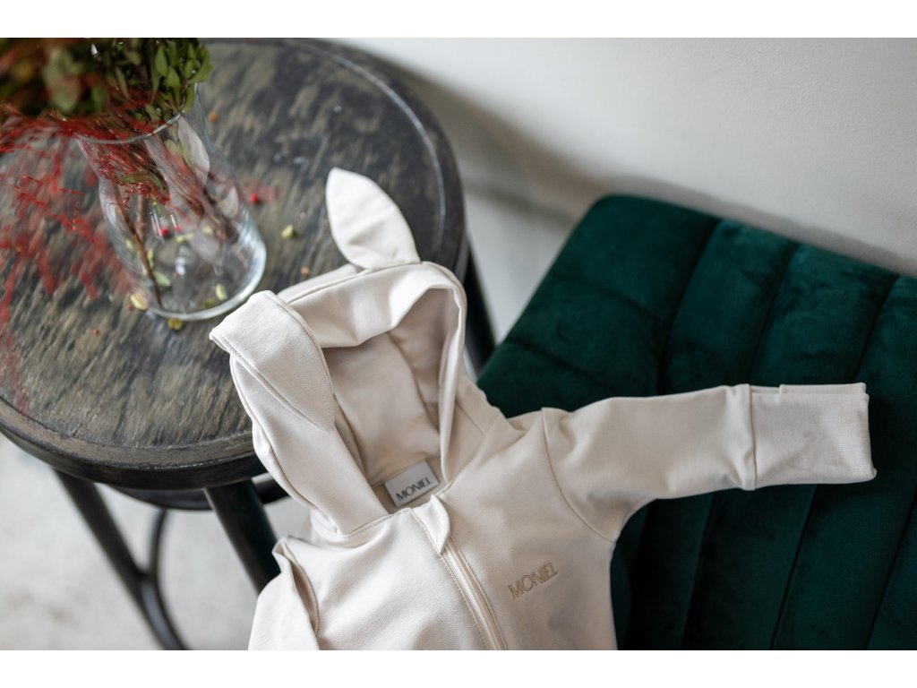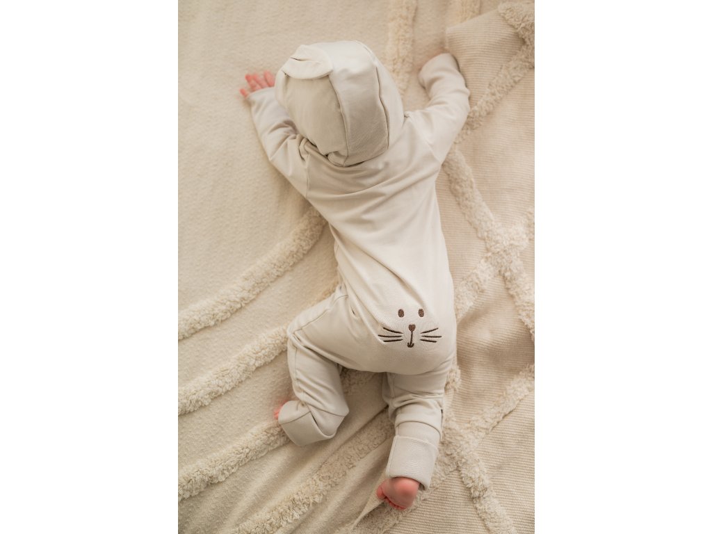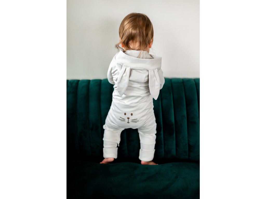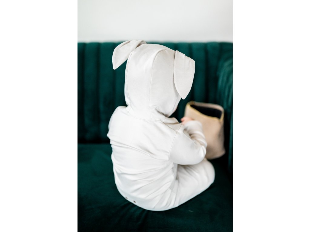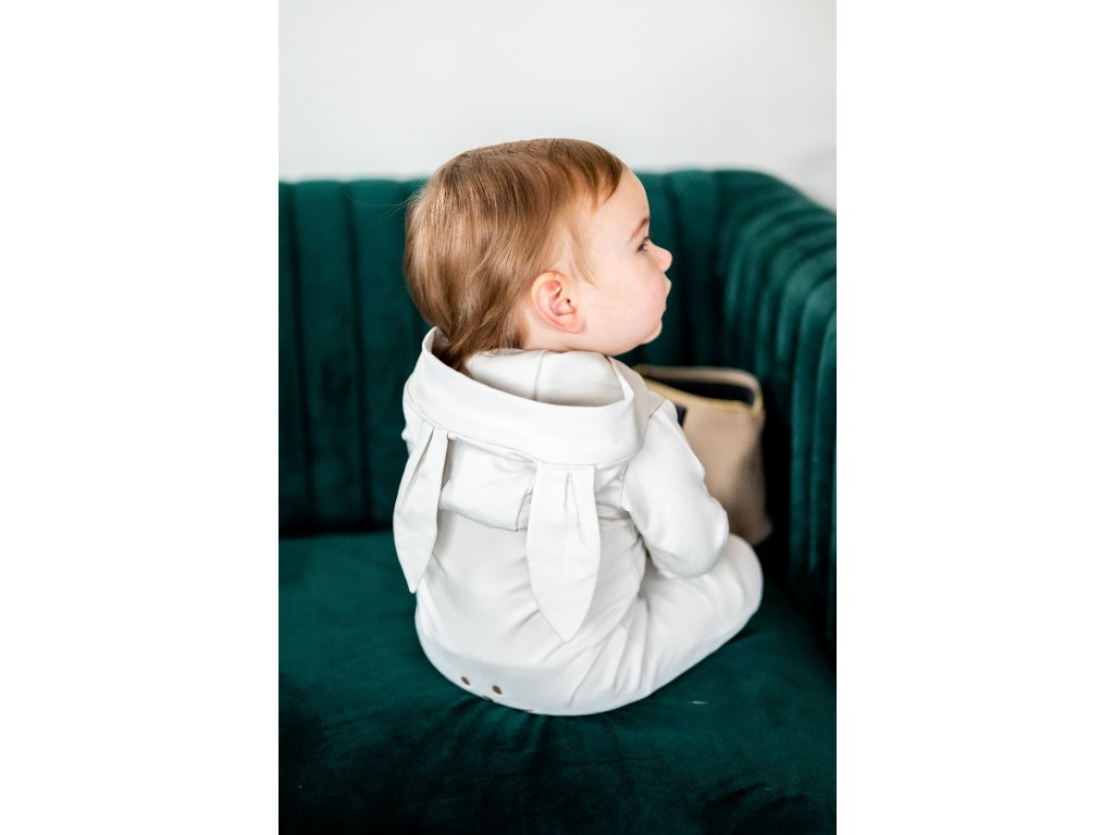Světlý perlově béžový overal má kapuci s roztomilými králičími oušky, která pomůže udržet hlavičku miminka v teple a zároveň doplňuje overálek o krásný designový prvek.