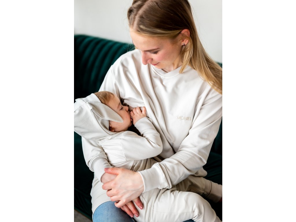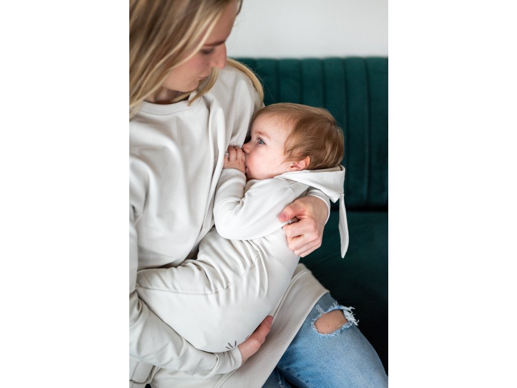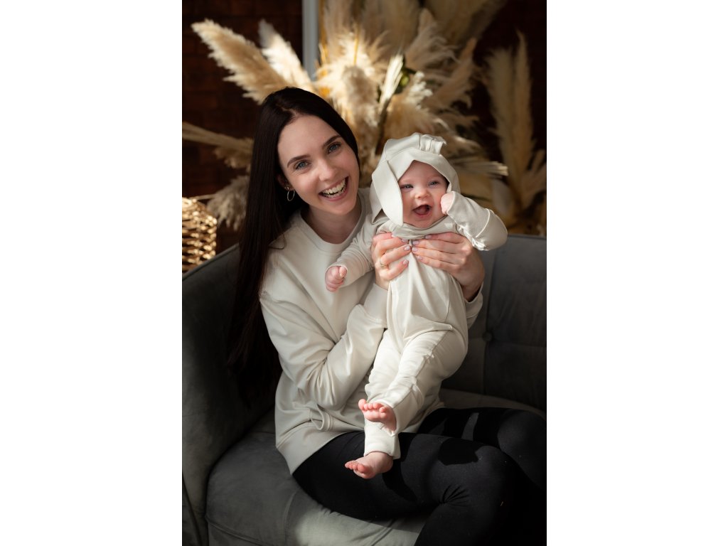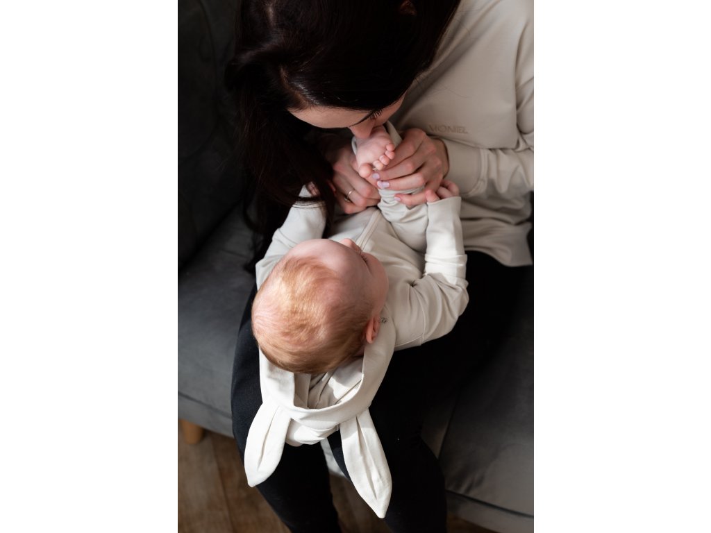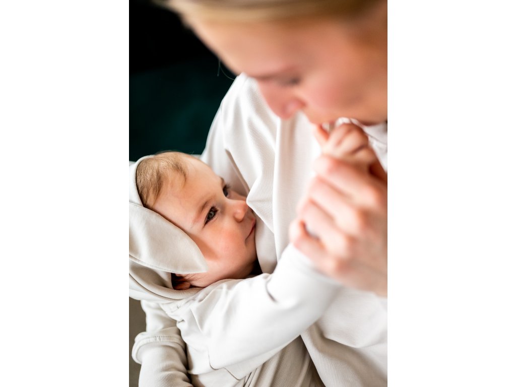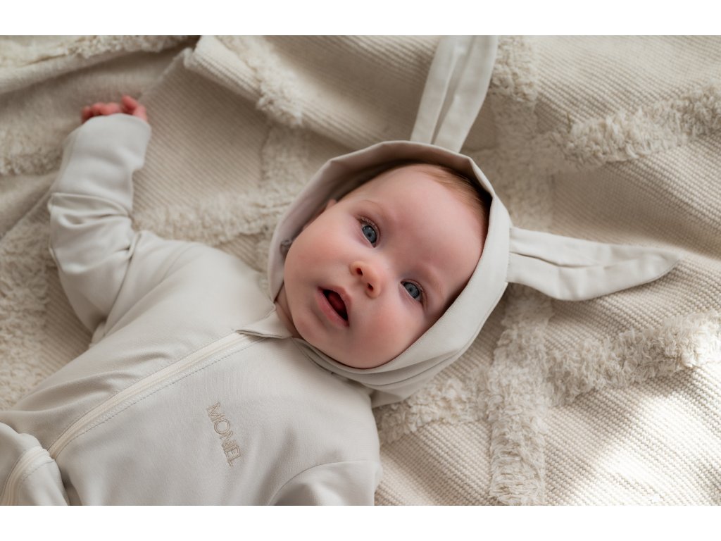 Světlý perlově béžový overal má kapuci s roztomilými králičími oušky, která pomůže udržet hlavičku miminka v teple a zároveň doplňuje overálek o krásný designový prvek.