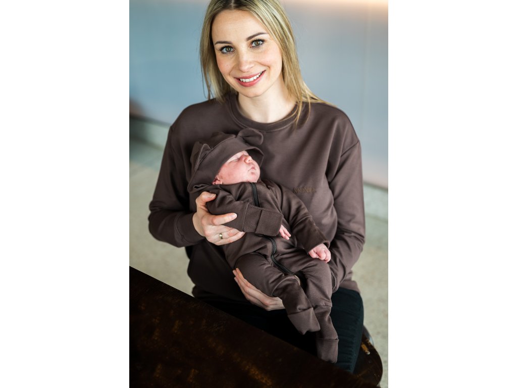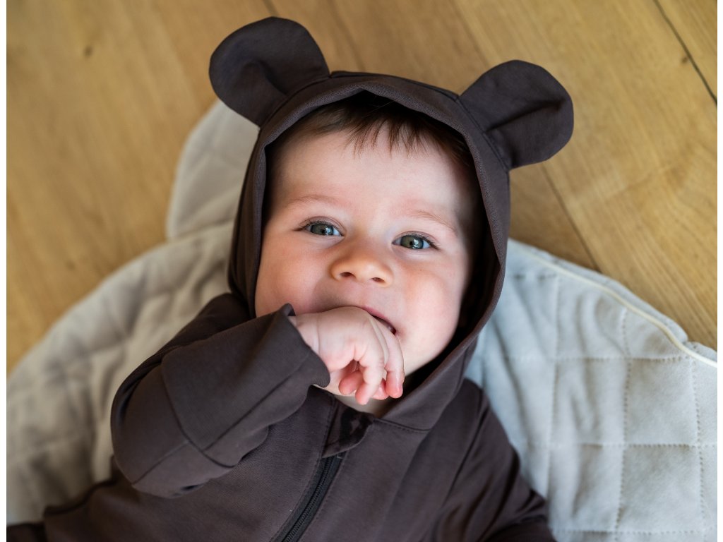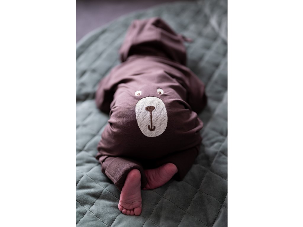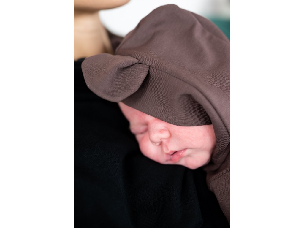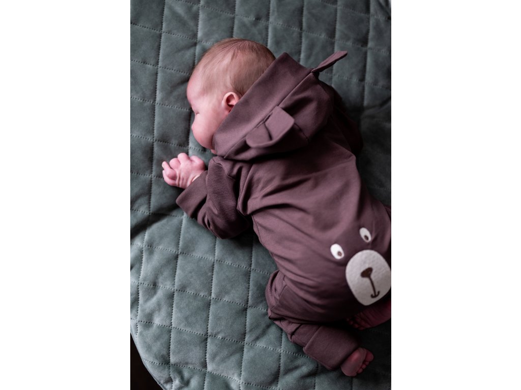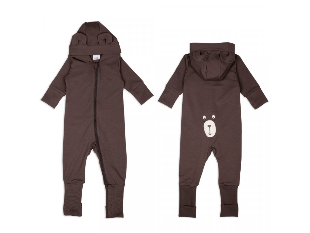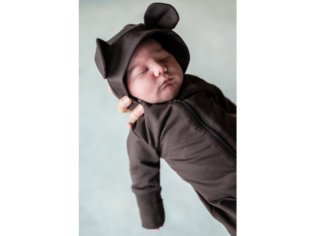 Tmavě hnědý overal má kapuci s roztomilými medvědími oušky, která pomůže udržet hlavičku miminka v teple a zároveň doplňuje overálek o krásný designový prvek.