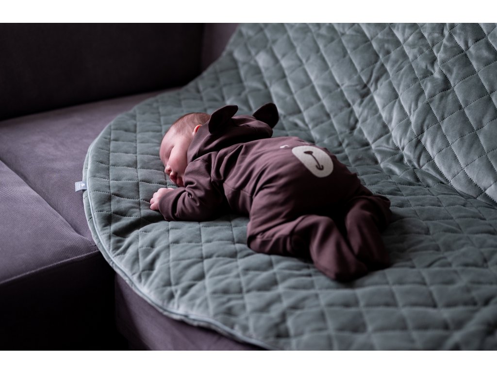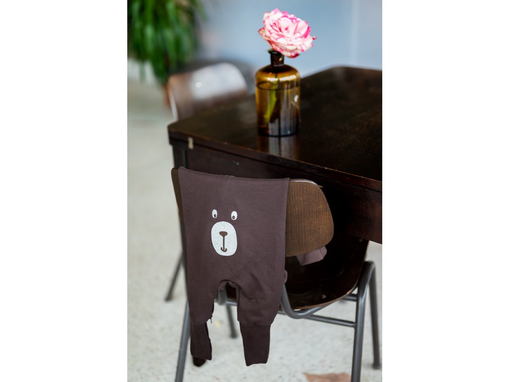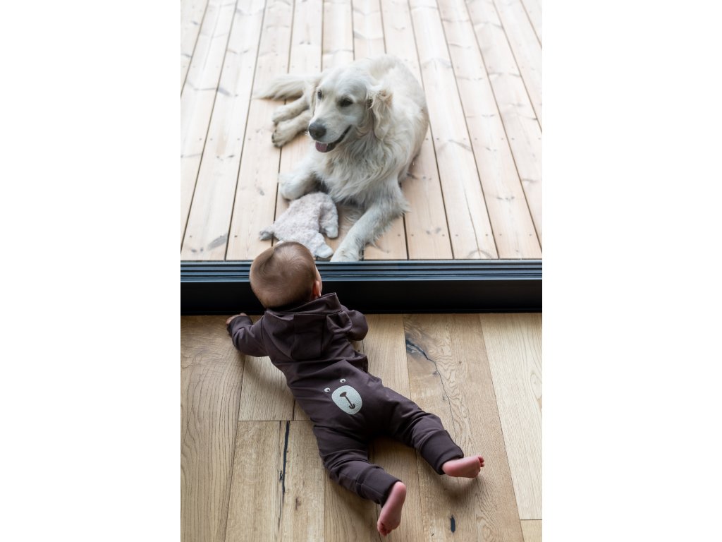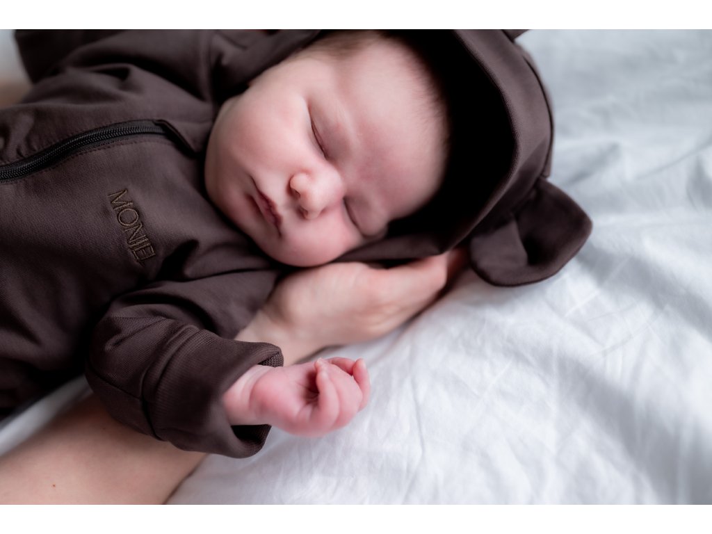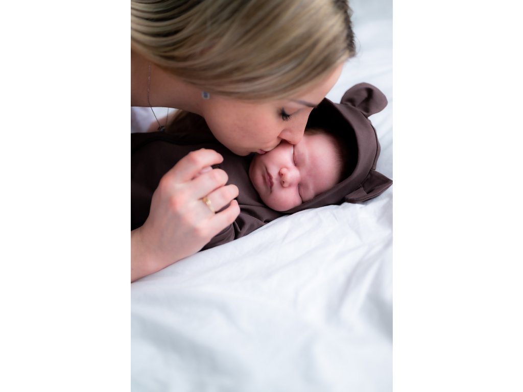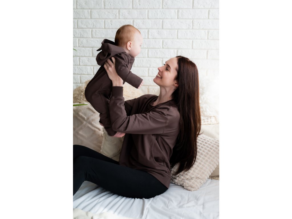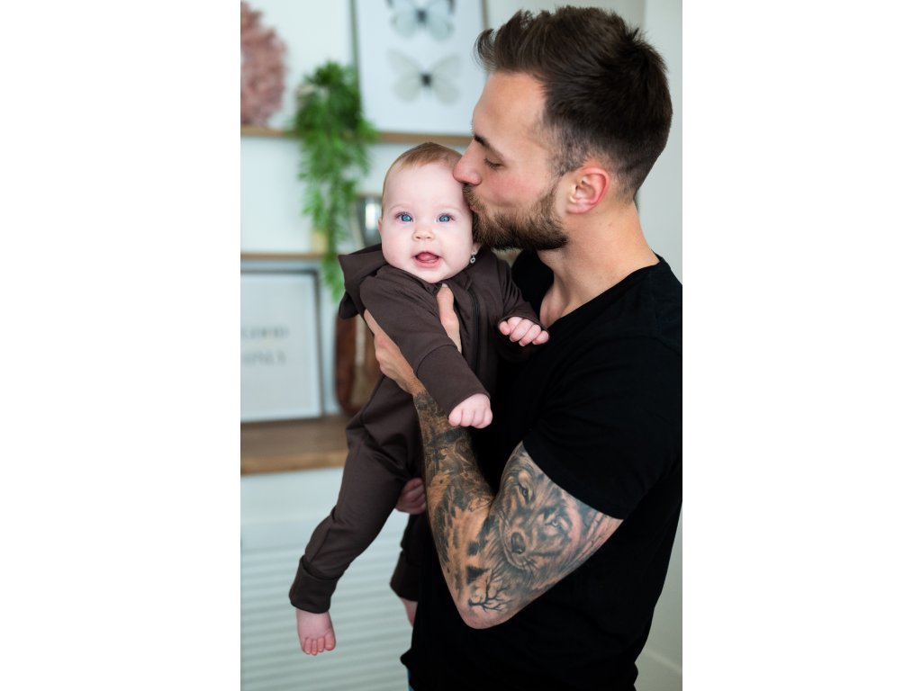 Tmavě hnědý overal má kapuci s roztomilými medvědími oušky, která pomůže udržet hlavičku miminka v teple a zároveň doplňuje overálek o krásný designový prvek.