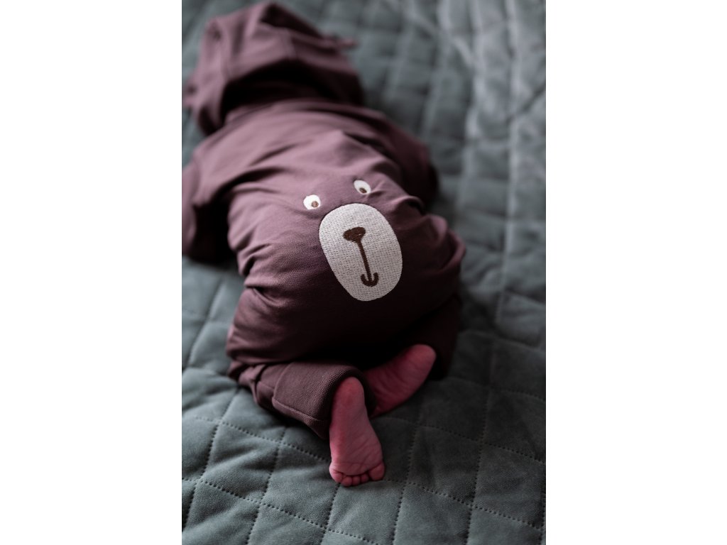 Mikinový materiál se nemačká, takže pokud nechcete, nemusíte jej žehlit. Autorský design overálku doplňuje roztomilá výšivka medvídka na zadní straně overálku.