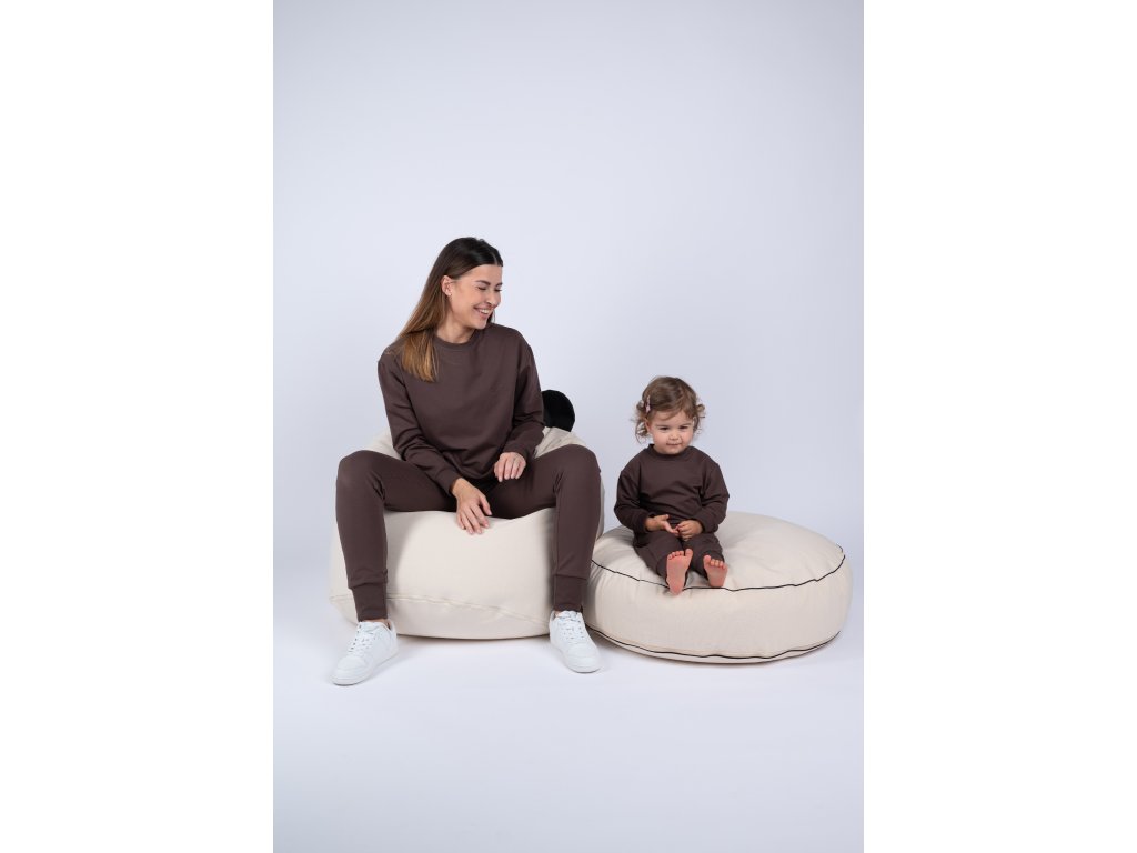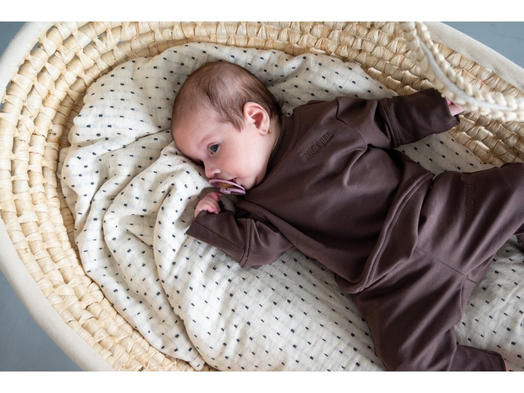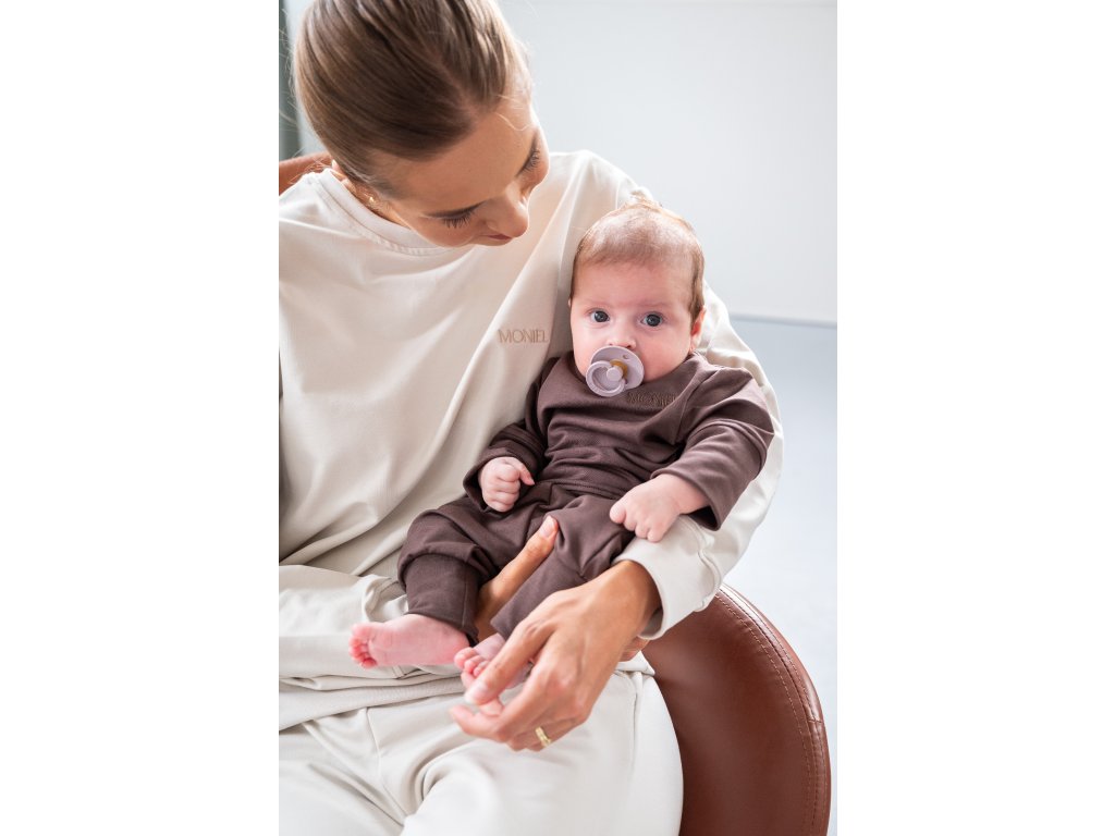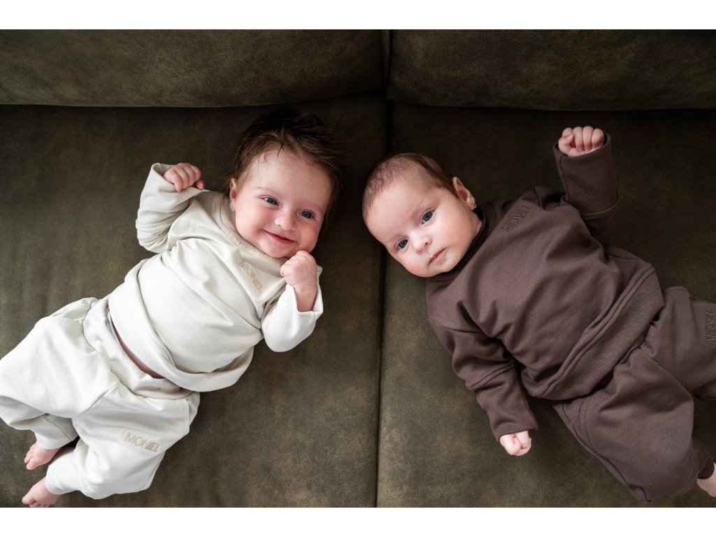 Je ušitá z velmi elastické látky, která je extrémně hebká a příjemná na dotek. Látku na Moniel soupravu jsme si nechali vyrobit na míru tak, aby byla heboučká, ale zároveň dlouho vydržela a netvořila žmolky. Vrchní vrstva látky je tkaná speciálním způsobem tak, aby vytvořila sametově jemný povrch, který je zároveň maximálně odolný. Můžete si tak být jistí, že i v případě častého praní zůstane teplákovka stále krásná.