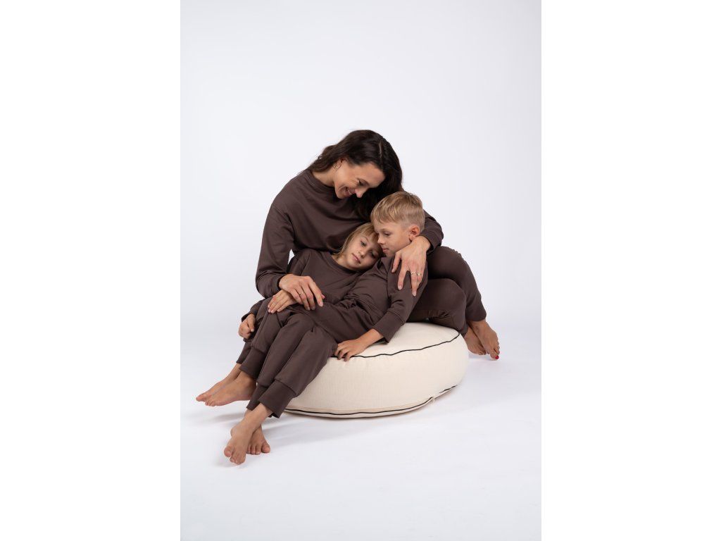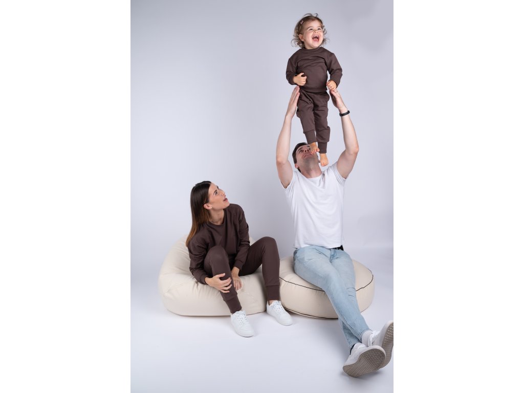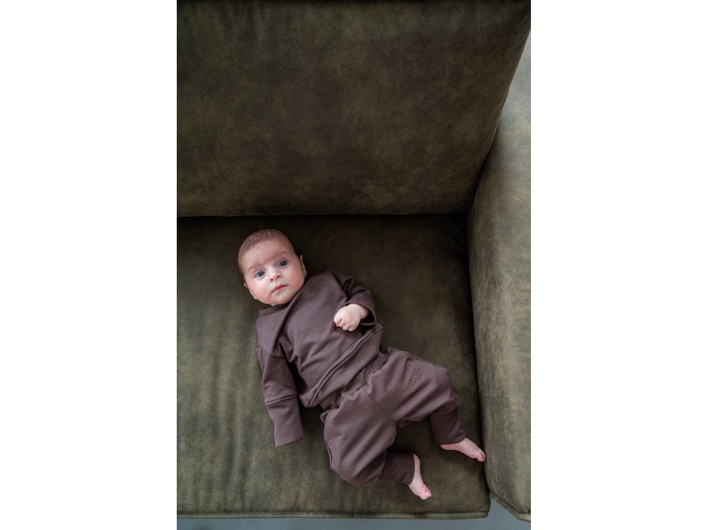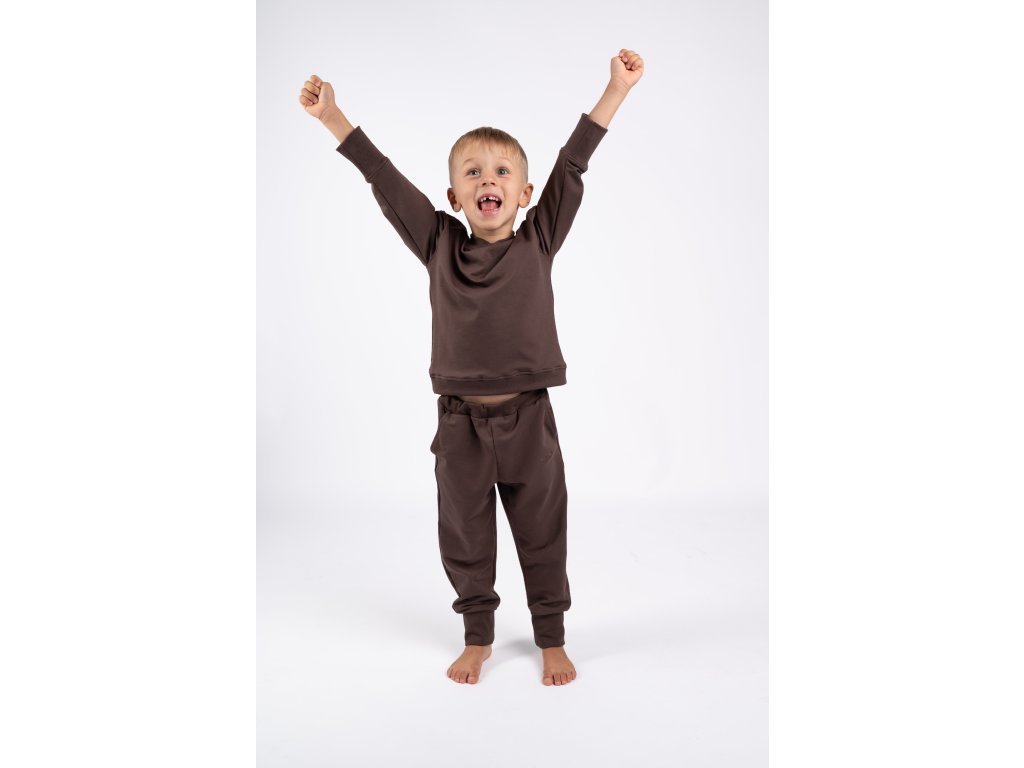 Tmavě hnědá souprava je velmi elastická, takže dítěti nebrání v pohybu, neškrtí a snadno se obléká.