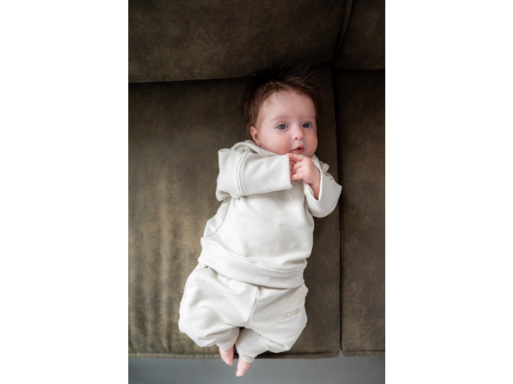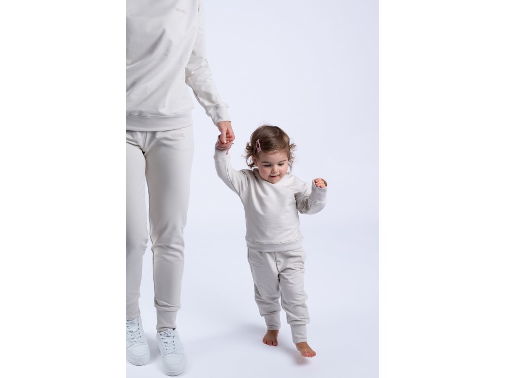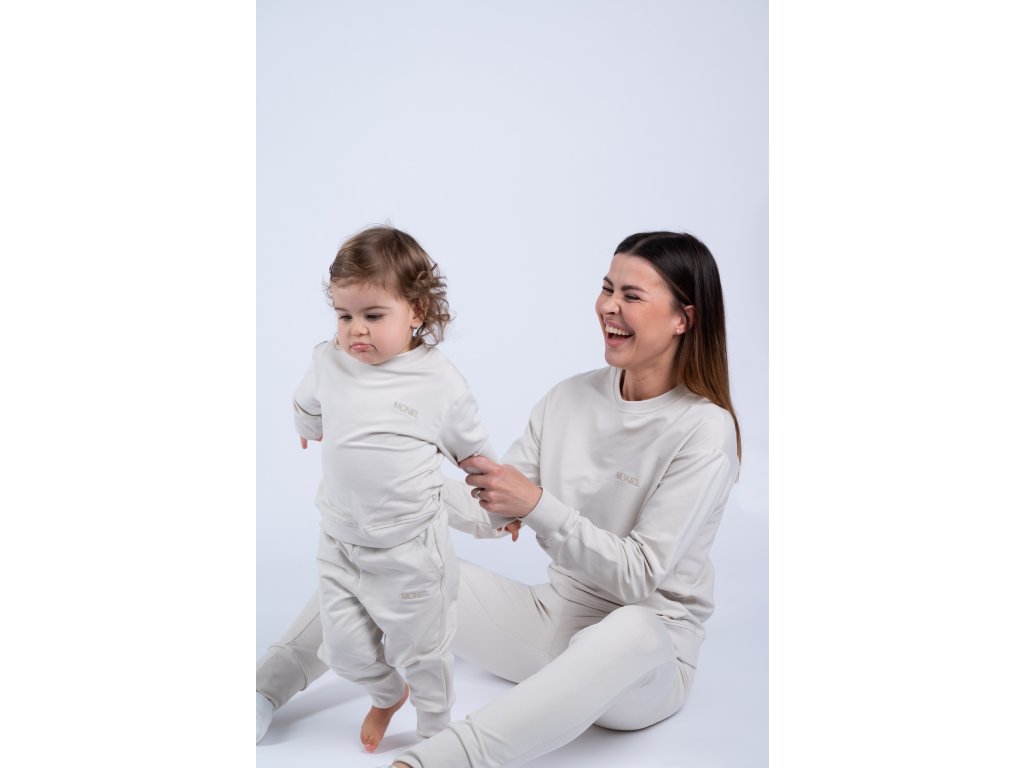 Je ušitá z velmi elastické látky, která je extrémně hebká a příjemná na dotek. Látku na Moniel soupravu jsme si nechali vyrobit na míru tak, aby byla heboučká, ale zároveň dlouho vydržela a netvořila žmolky. Vrchní vrstva látky je tkaná speciálním způsobem tak, aby vytvořila sametově jemný povrch, který je zároveň maximálně odolný. Můžete si tak být jistí, že i v případě častého praní zůstane teplákovka stále krásná.
