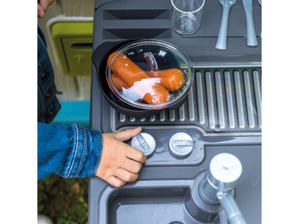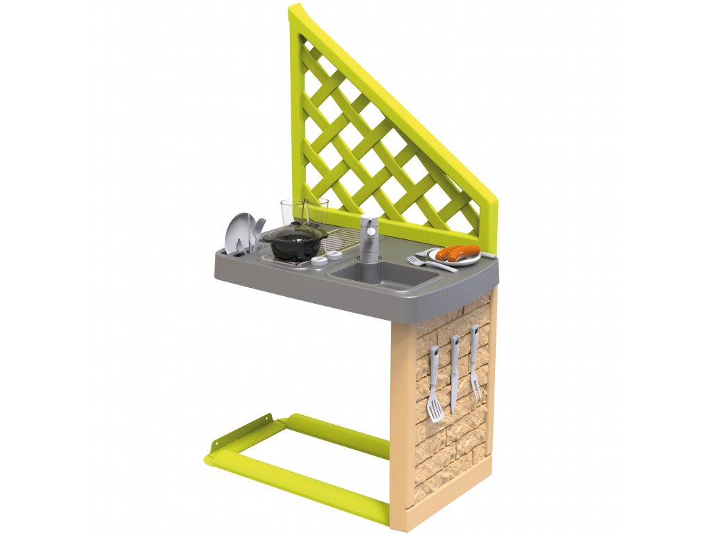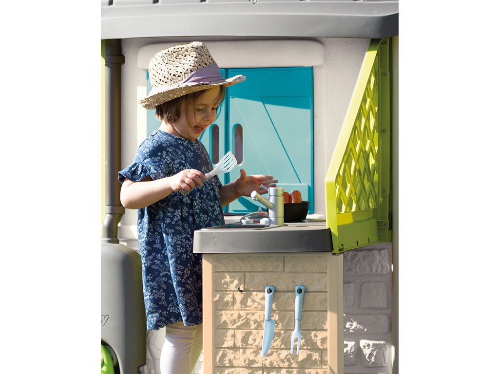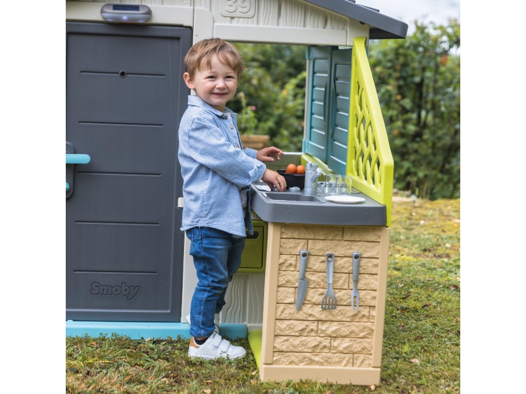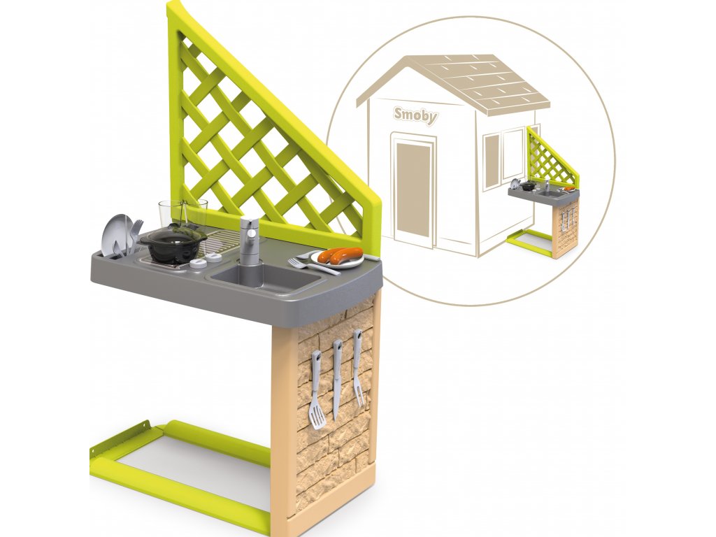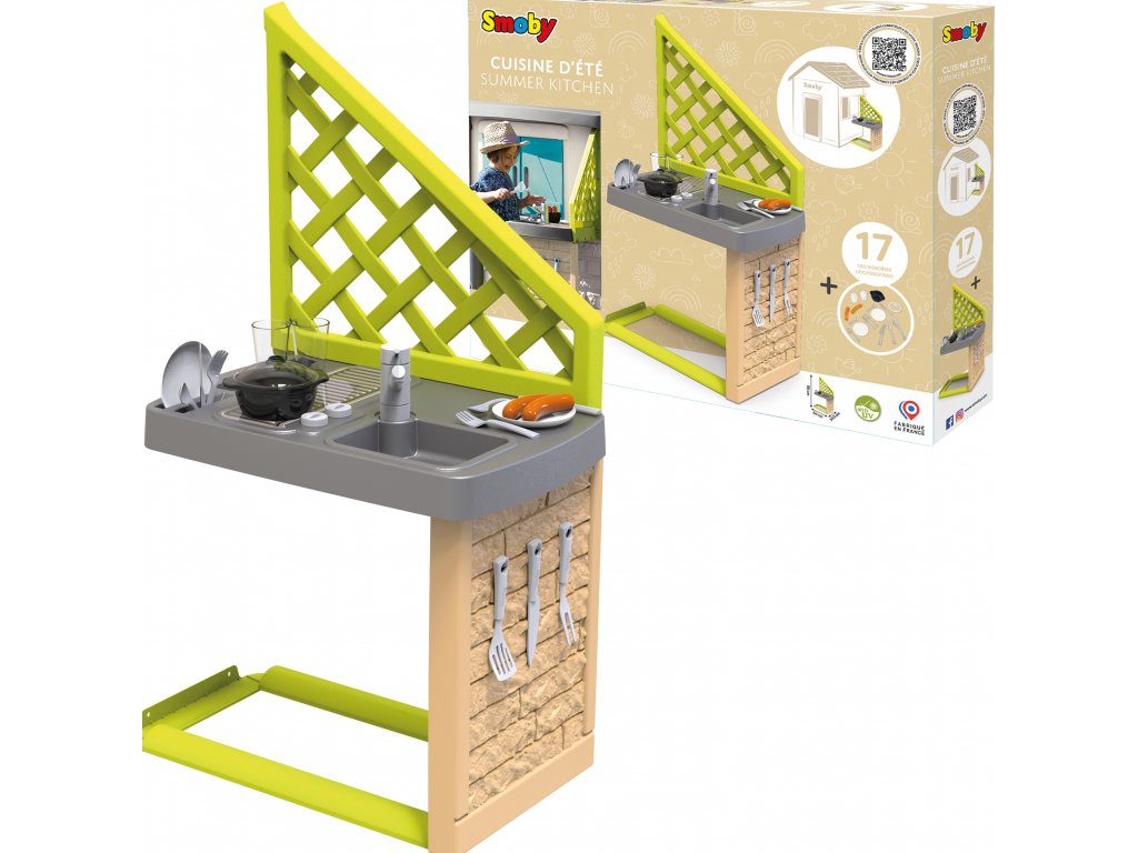 Letní kuchyně od SMOBY je dokonalým doplňkem k velkému hnědému domu, který se díky ní stává realističtějším! Děti si mohou svůj domeček přizpůsobit vlastním preferencím tím, že jej vybaví letní kuchyňkou. Díky tomu bude domek vypadat jako skutečný domov. Děti si mohou užívat vaření chutných pokrmů na čerstvém vzduchu. Kuchyňka obsahuje gril a 17 doplňků: klobásy, sklenice, talíře, příbory, vše, co potřebujete k příjemnému posezení na zahradě! Letní kuchyně je odolná vůči UV záření, díky čemuž si dlouho zachovává odolnost a živé barvy. Dveře jsou určeny pro děti od 2 let.