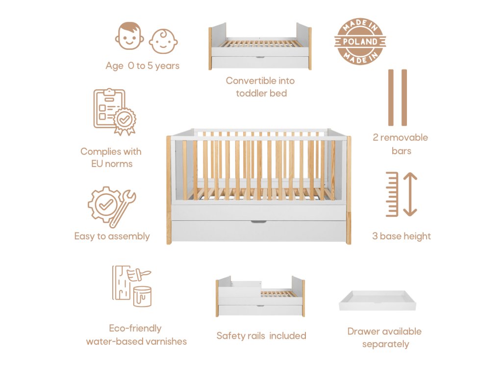 - tři úrovně rámu matrace přizpůsobené vývoji dítěte (umístěné ve výšce 59,5/45,5/28 cm od podlahy)