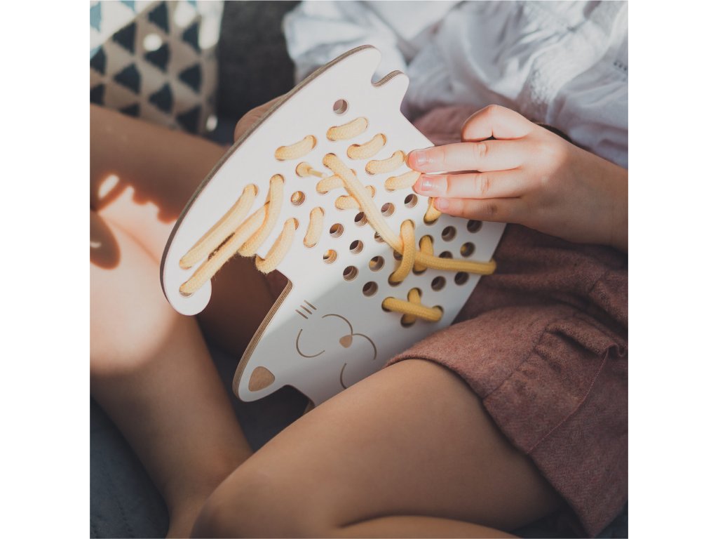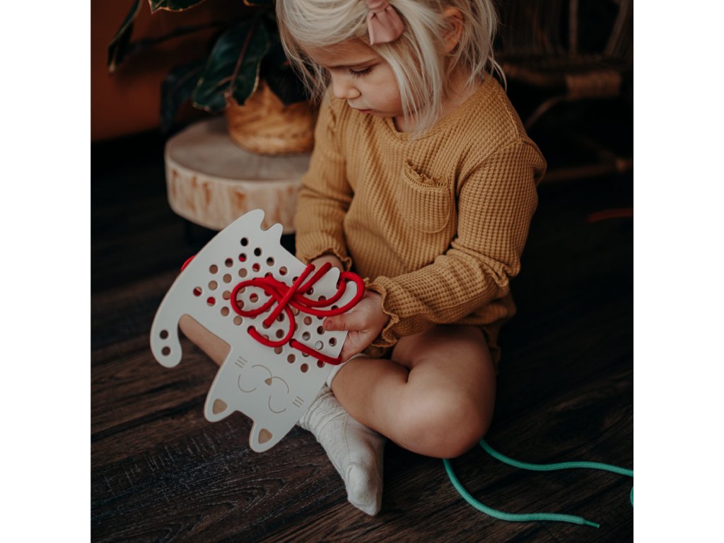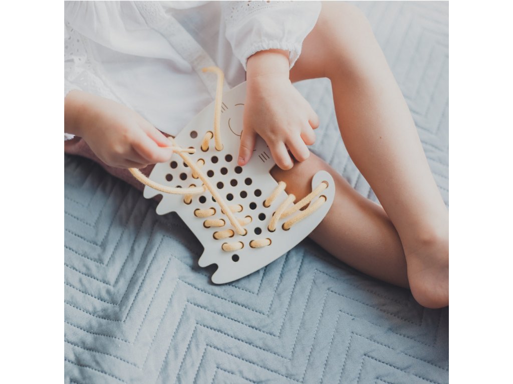 Je prokázáno, že provlékáním tkaničky dítě trénuje jemnou motoriku, přesnost a díky tomu připravuje ruku na psaní. Ne nadarmo byla tato hračka oceněna jako Hračka roku 2020 v kategorii předškolní hračky!