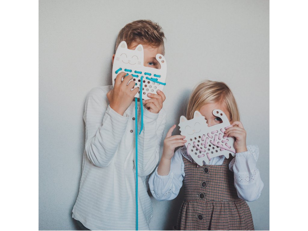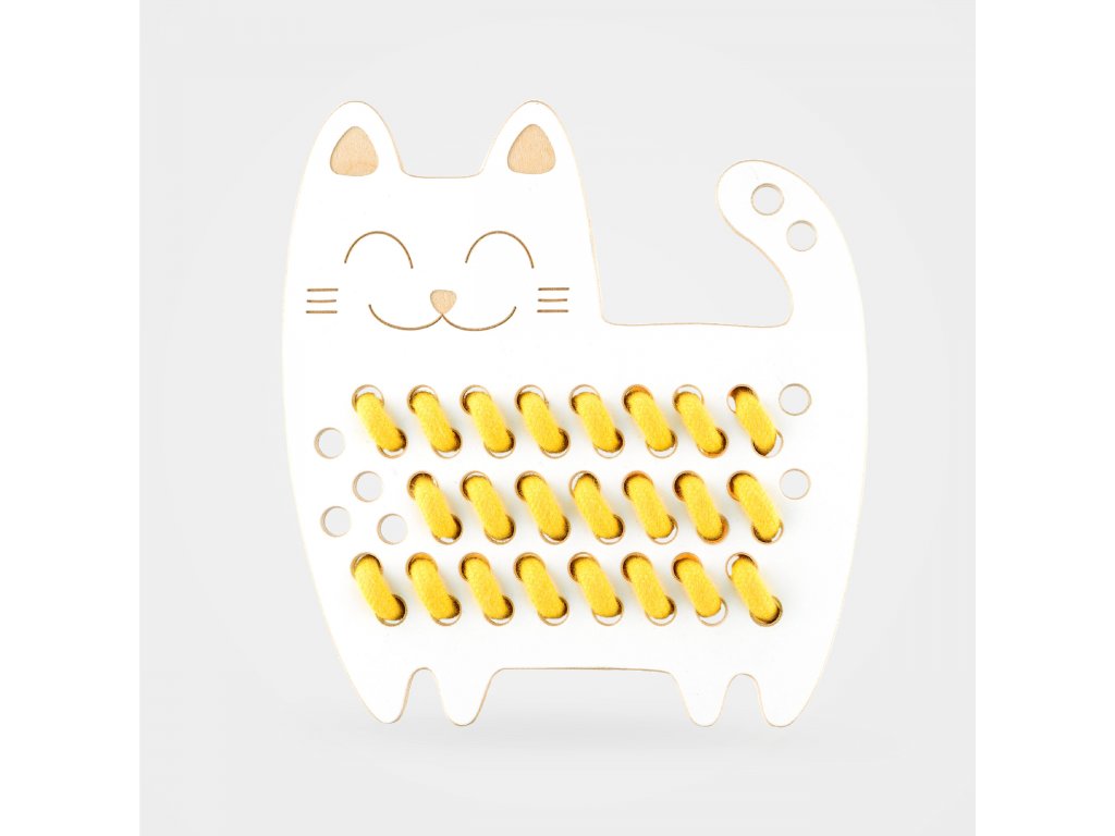 Smyslupná hračka dřevěné provlékání provázků kočka rozvíjí kreativitu, představivost, soustředění a jemnou motoriku a připravuje dětskou ruku na psaní.