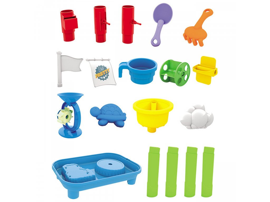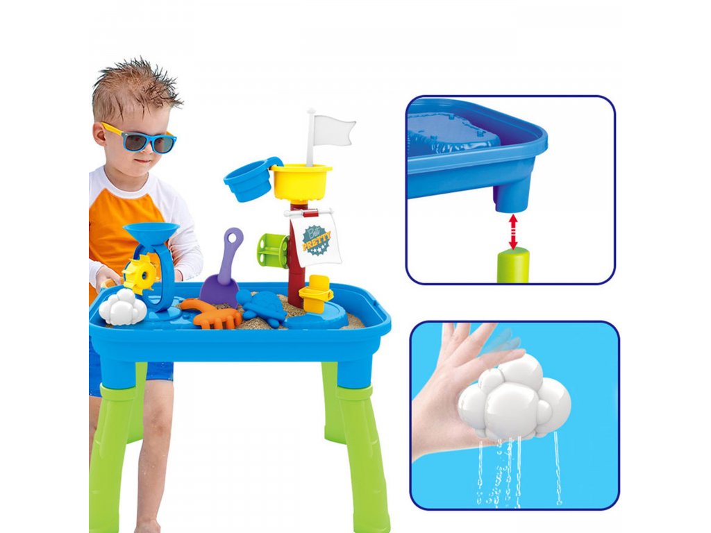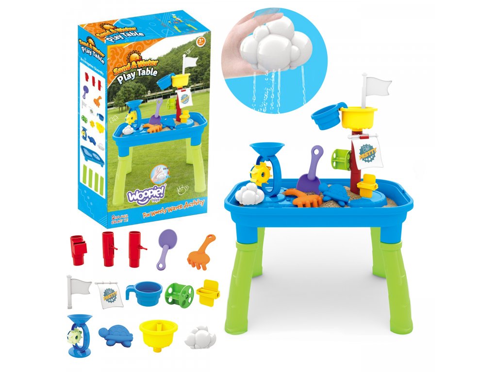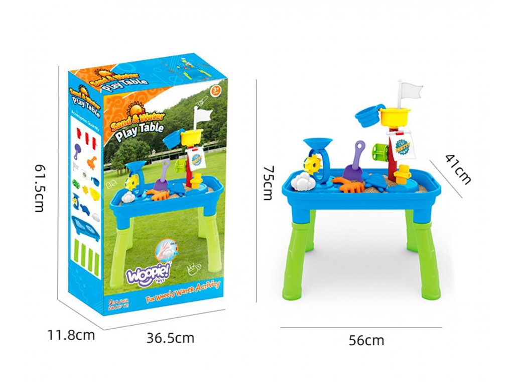 Stůl na hraní 2v1 od značky Woopie je ideální hračka pro hraní s vodou a pískem. Sada obsahuje spoustu doplňků na hraní, včetně formiček, hrábí, lopaty a mnoha dalších. Pomocí šálku může dítě nalít vodu po stěžni a sledovat, jak se voda pohybuje vodními mlýny. Sada je určena pro vnitřní i venkovní hraní. Ideální pro hraní doma, na pláži nebo na pískovišti.