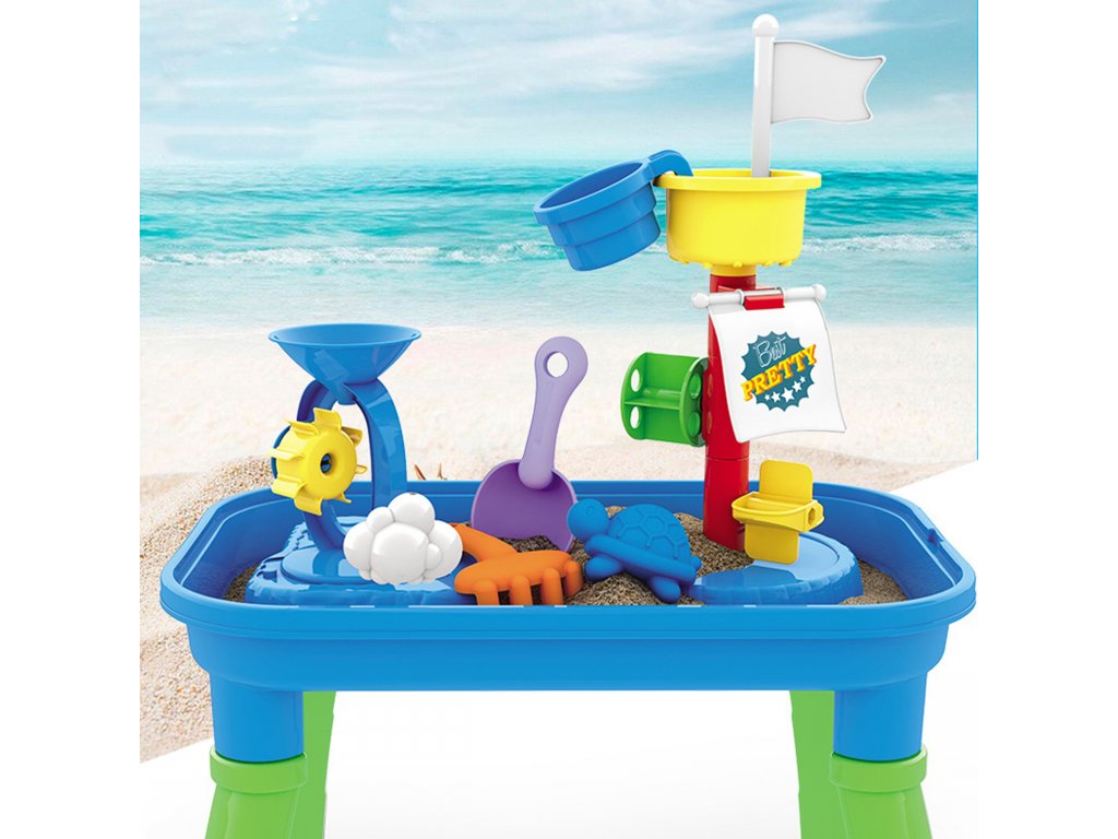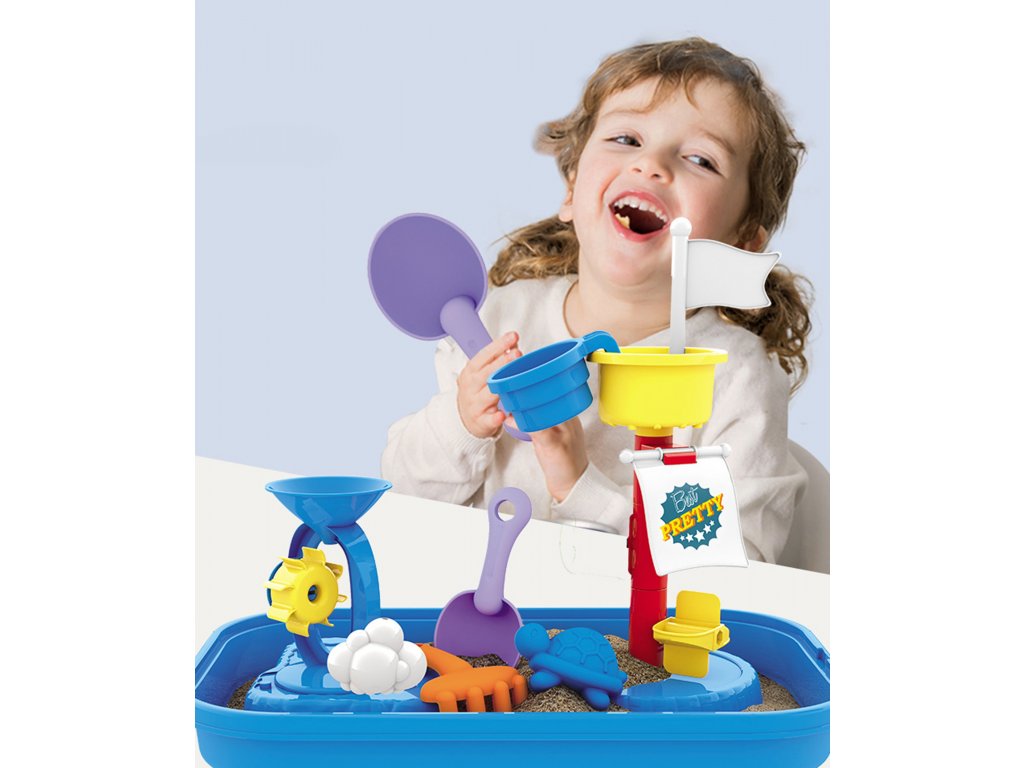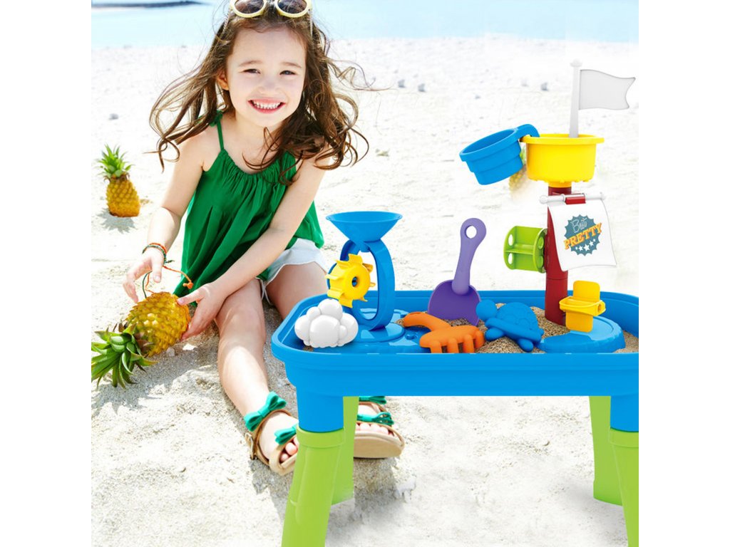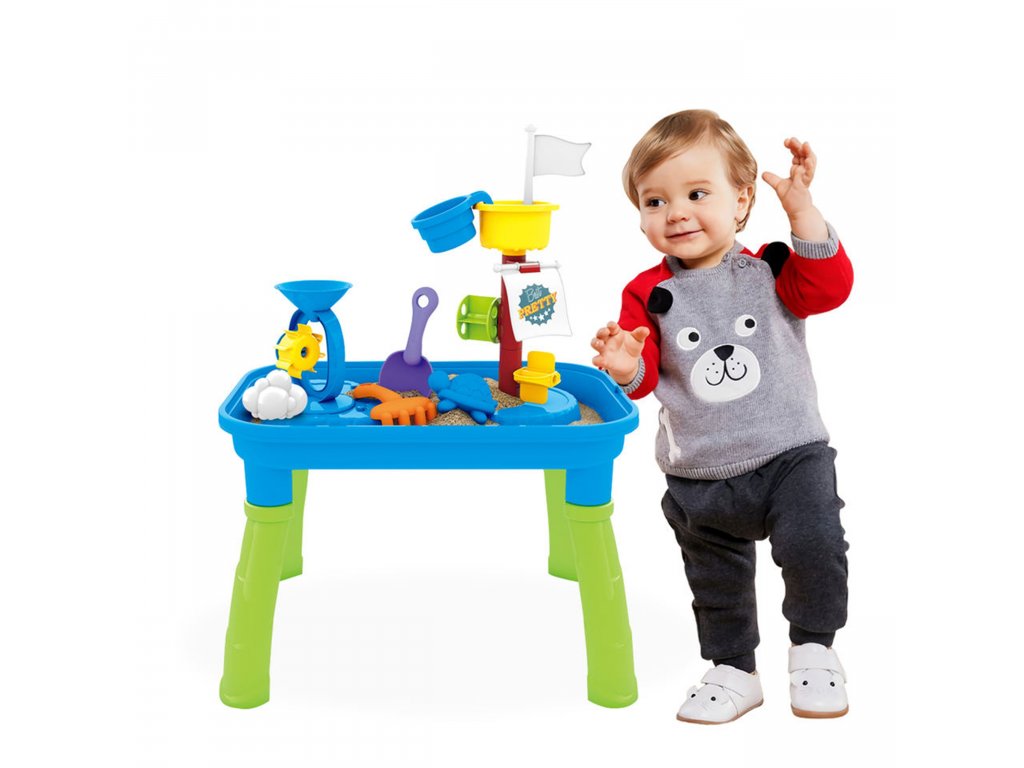 Stůl na hraní 2v1 od značky Woopie je ideální hračka pro hraní s vodou a pískem. Sada obsahuje spoustu doplňků na hraní, včetně formiček, hrábí, lopaty a mnoha dalších. Pomocí šálku může dítě nalít vodu po stěžni a sledovat, jak se voda pohybuje vodními mlýny. Sada je určena pro vnitřní i venkovní hraní. Ideální pro hraní doma, na pláži nebo na pískovišti.