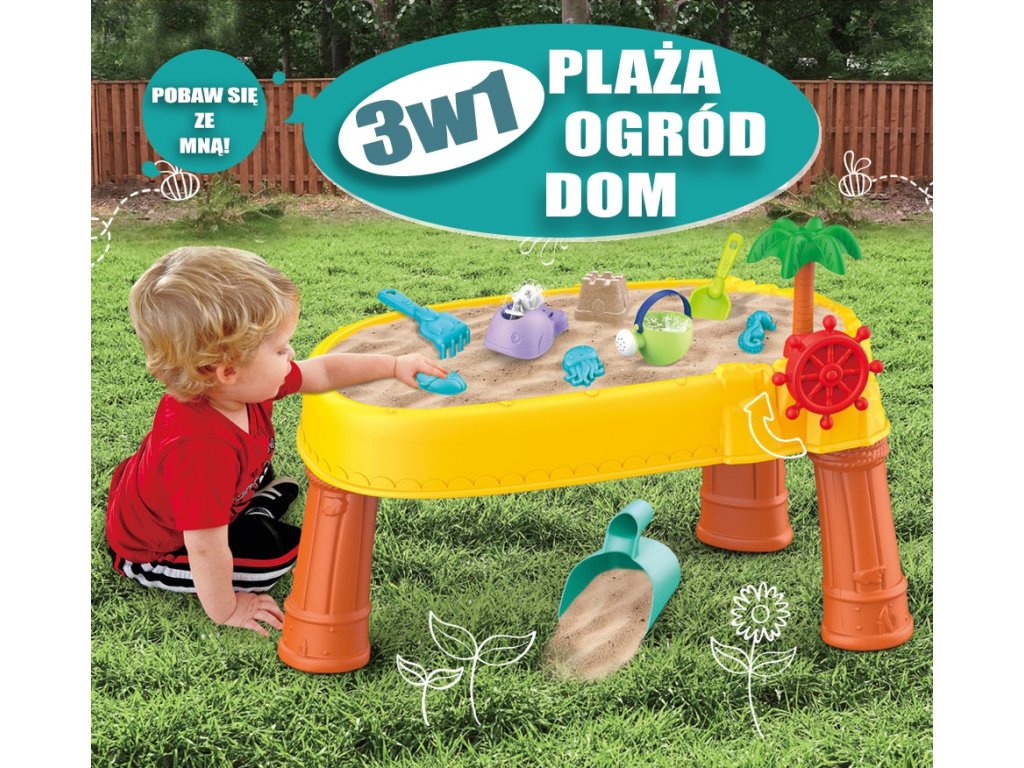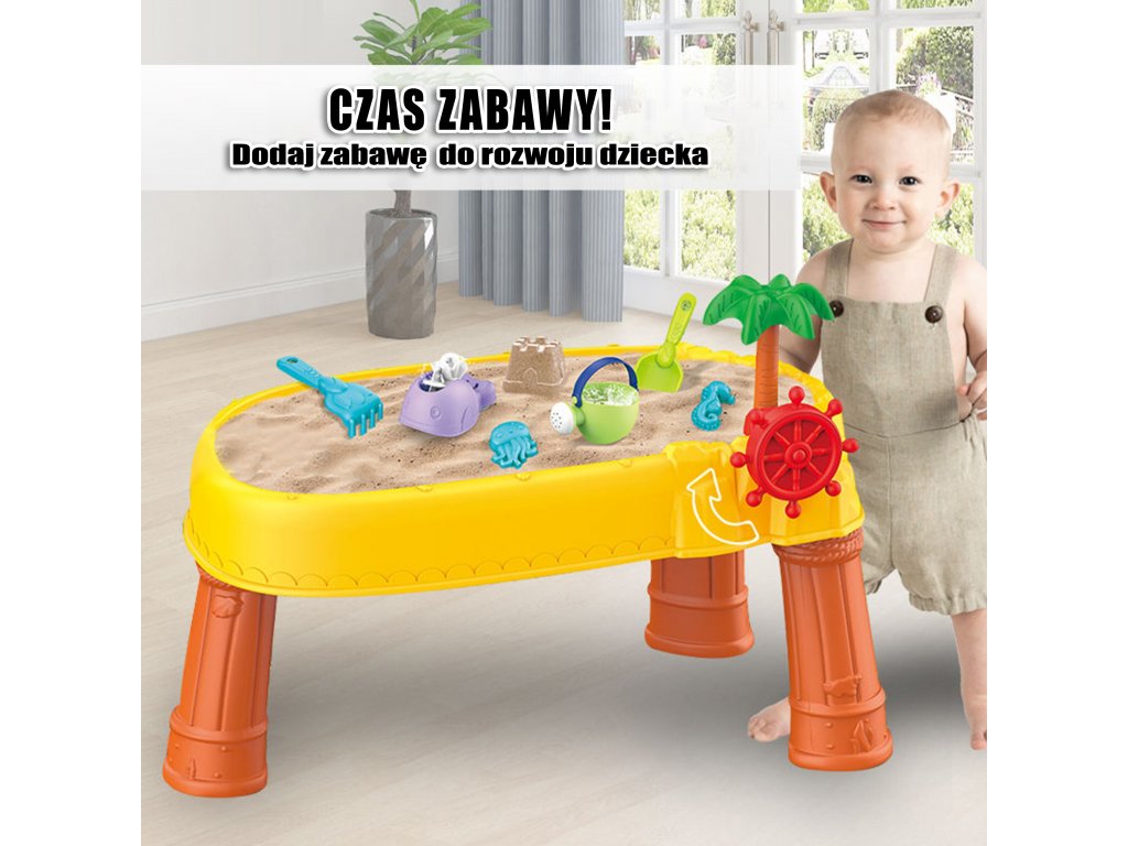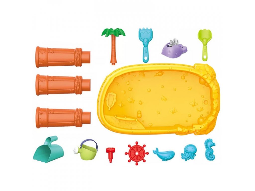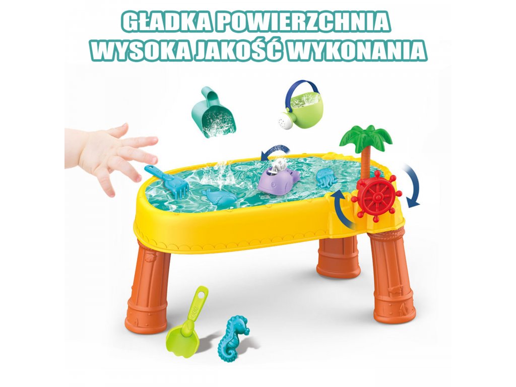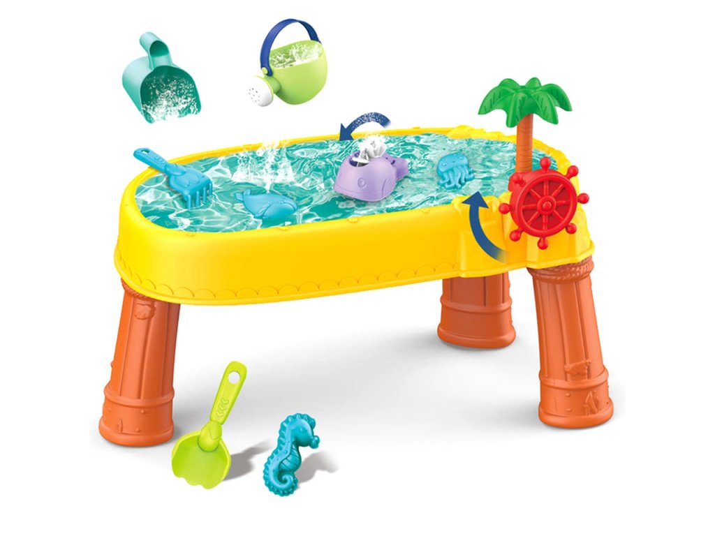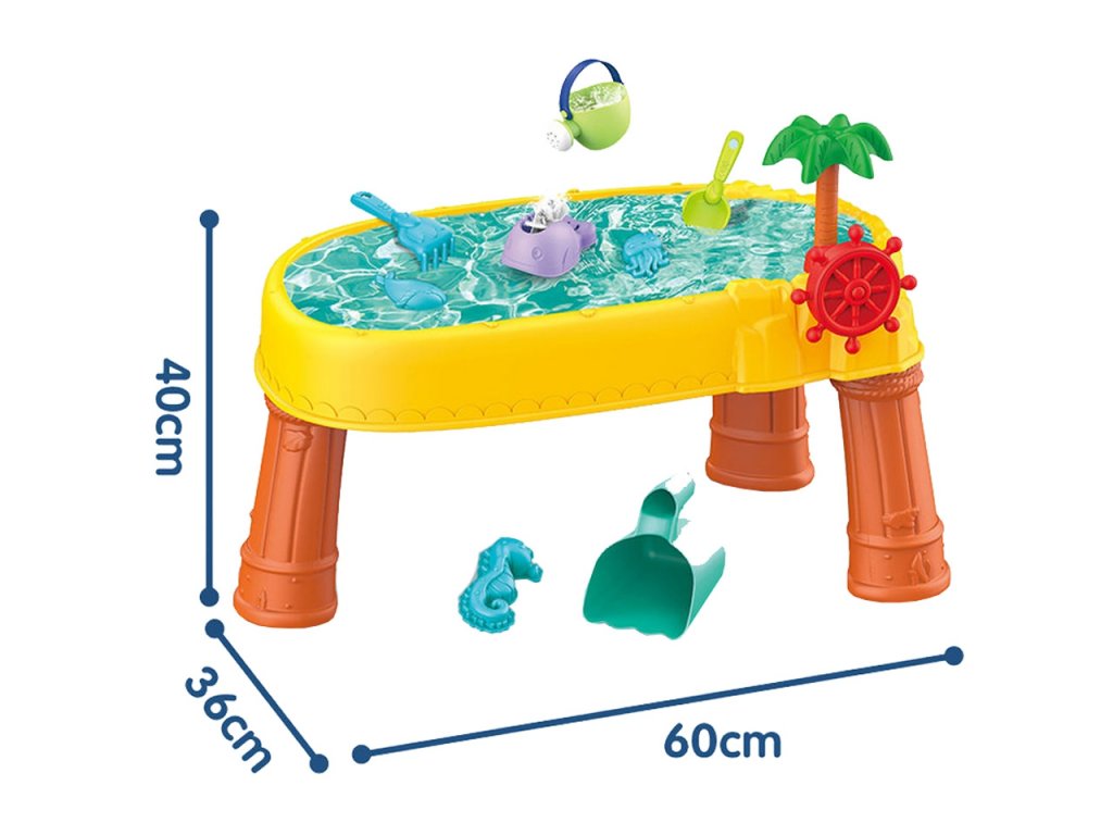 Stůl na hraní 2v1 od značky Woopie je ideální hračka pro hraní s vodou a pískem. Sada obsahuje 8 doplňků:3 formičky, rybku, konev, nádobu s rukojetí, hrábě a lopatku. Stůl má volant, kterým můžete otáčet a cítit se jako skutečný pirát. Sada je určena pro vnitřní i venkovní hraní. Ideální pro hraní doma, na pláži nebo na pískovišti.