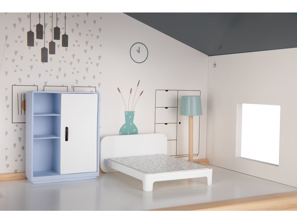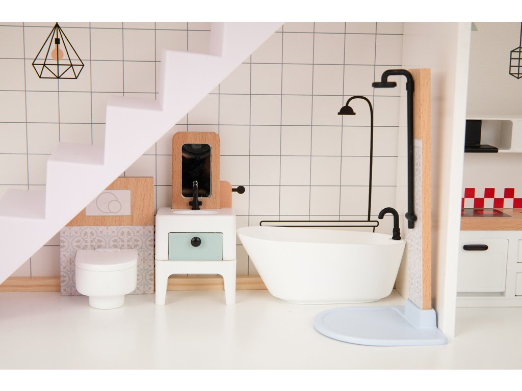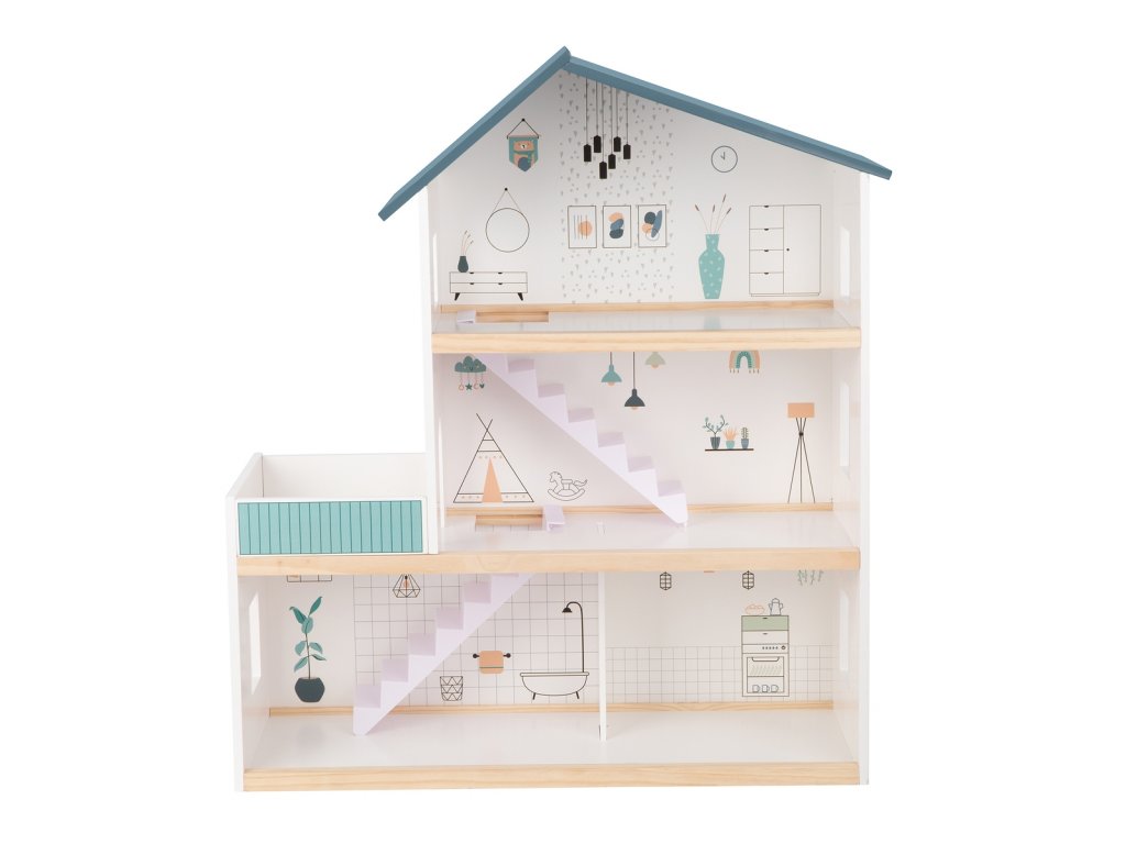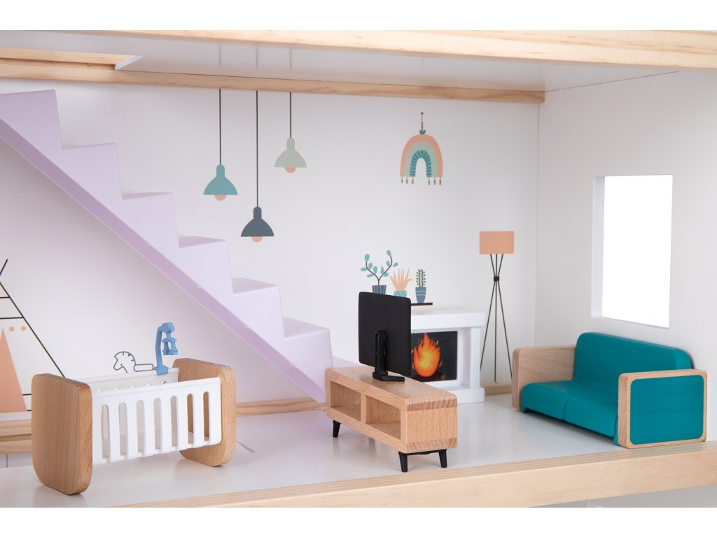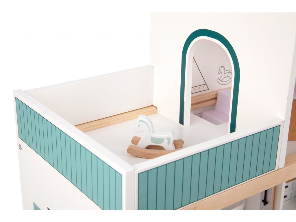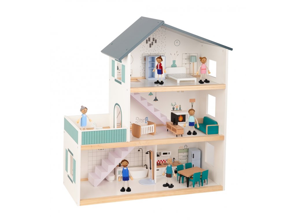 Dřevěný domeček pro panenky od Tooky bude splněným snem mnoha dívek a poskytne hodiny nezapomenutelné zábavy, která podněcuje fantazii a formuje společenské kontakty. Dům má 3 patra, v přízemí je koupelna a kuchyně, ve druhém patře obývák s balkonem a ve třetím najdeme ložnici. Sestava obsahuje 6 figurek. Domeček je dodáván s příslušenstvím. Pro děti od 3 let.