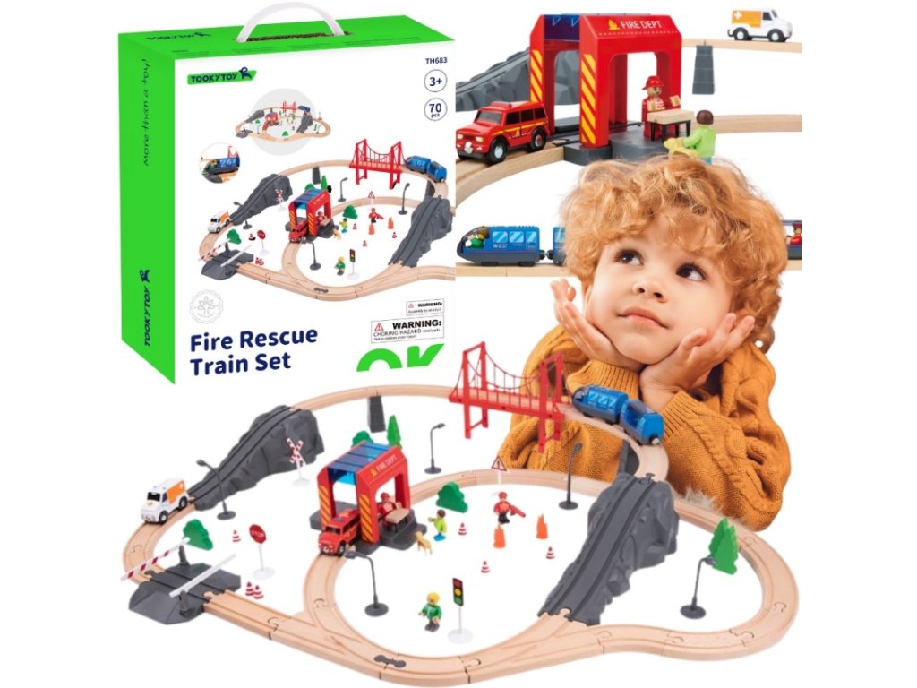 TOOKY TOY dřevěný elektrický vláček - hasičská záchranná stanice 70 ks