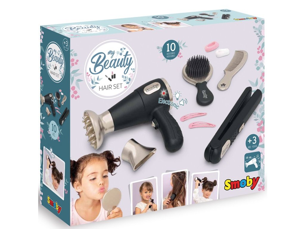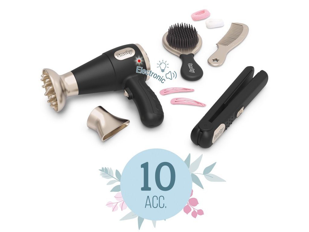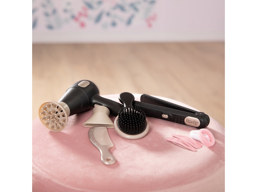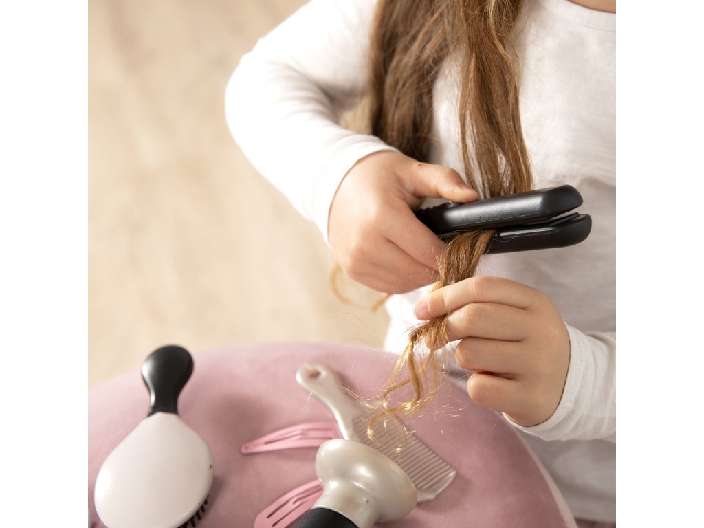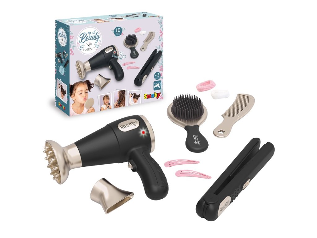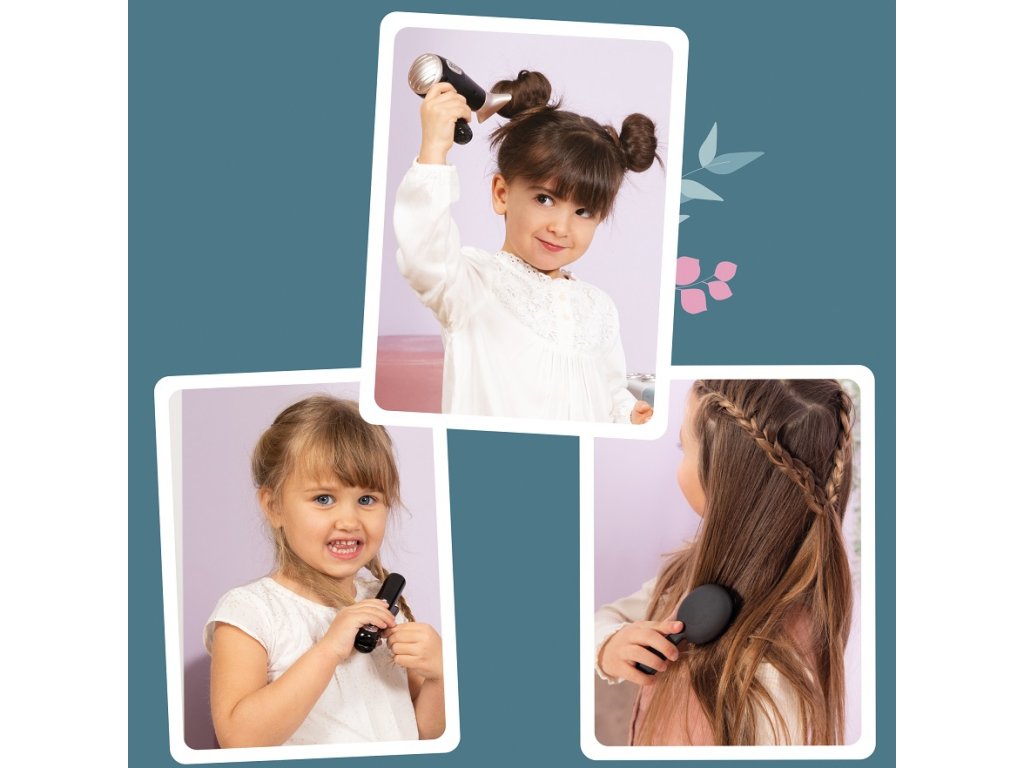 - Součástí jsou fén s světelnými a zvukovými efekty, nástavce na fén, žehlička na vlasy, hřeben, kartáč, spony a gumičky