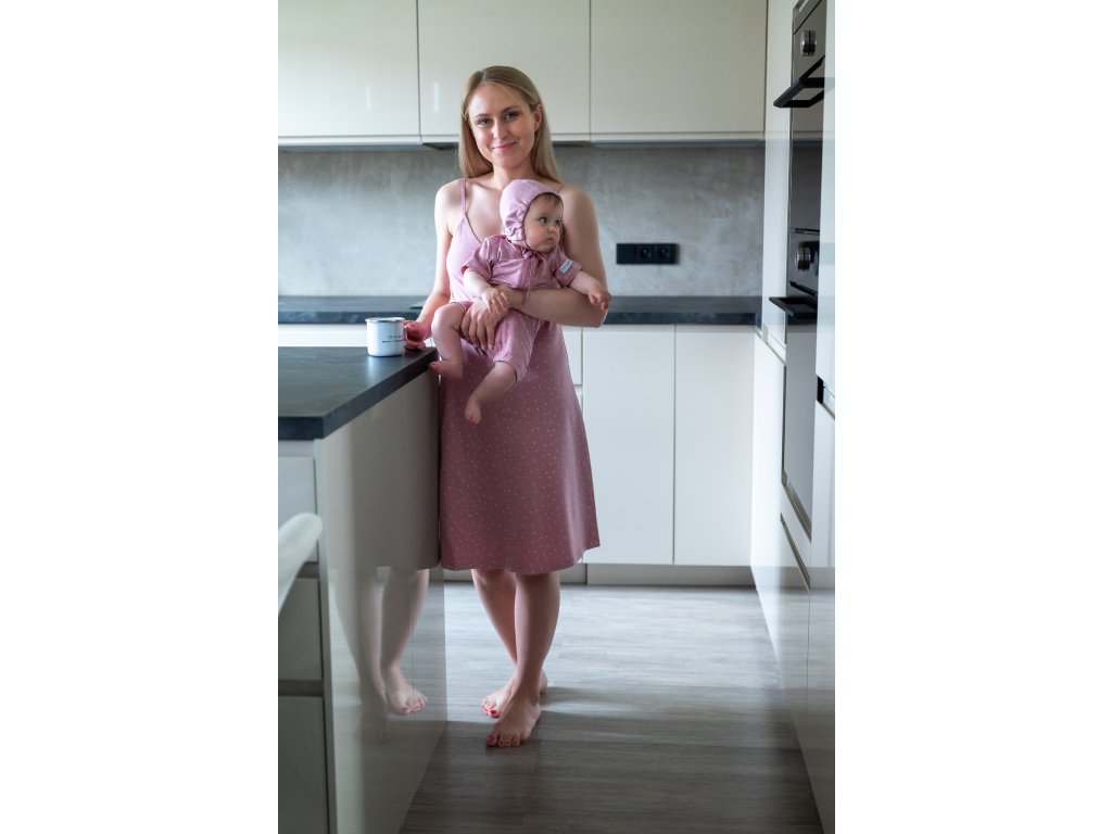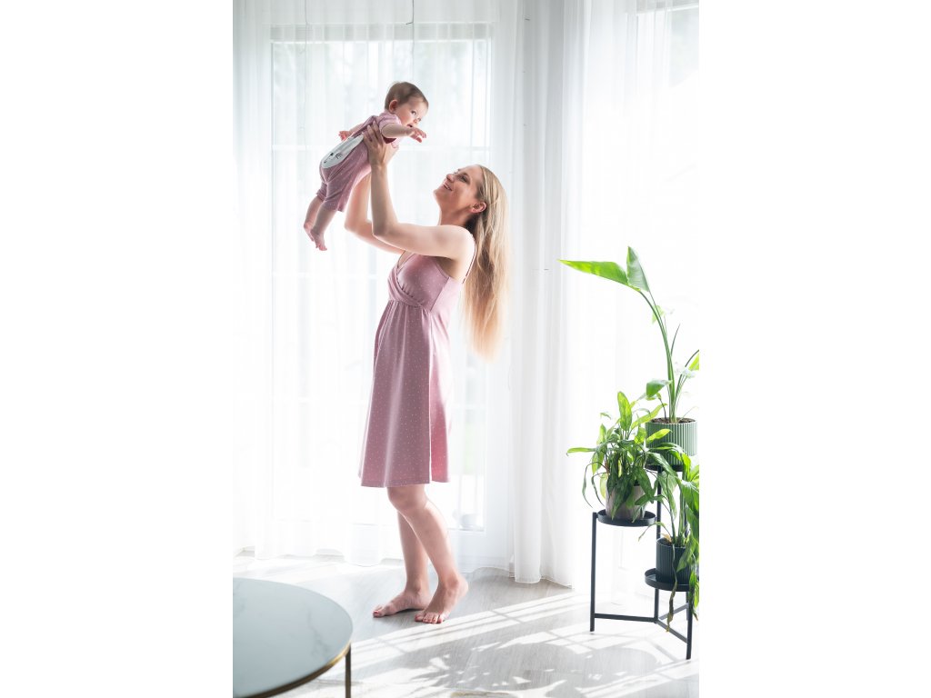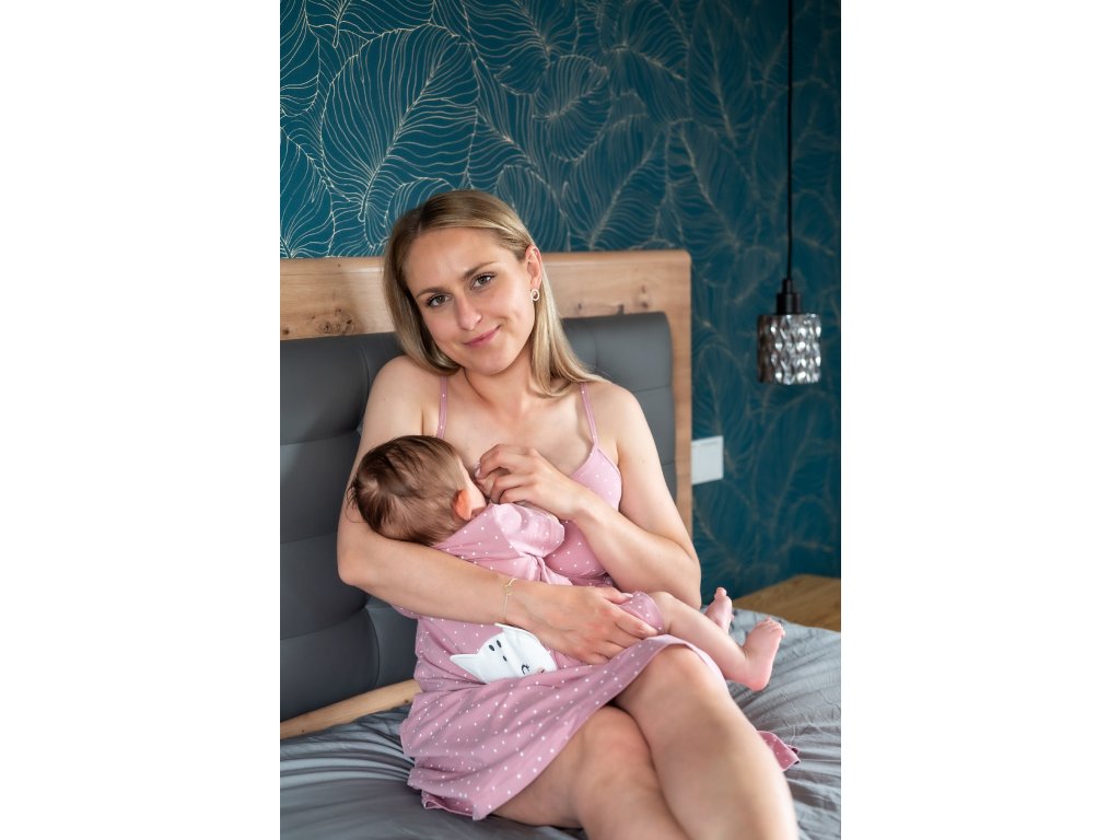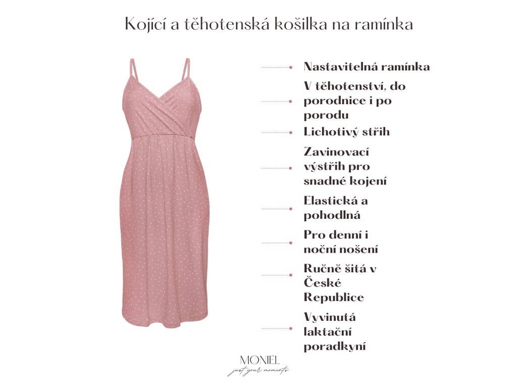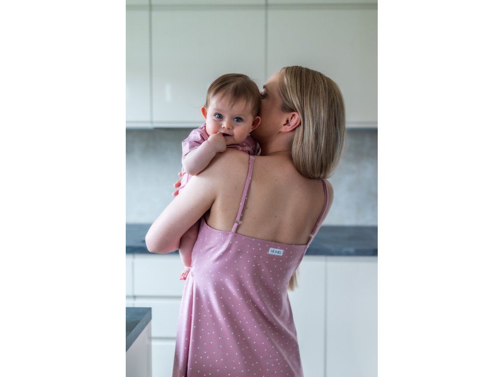 Dámská těhotenská a kojící košilka na ramínka Moniel Dots růžová je noční košilka a pohodlné domácí šaty v jednom! Je to multifunkční kousek oblečení, který vám vydrží po celou dobu těhotenství, kojení a mateřství.