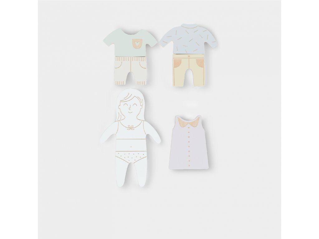 Sada obsahuje dřevěnou desku a 5 kusů oblečení.