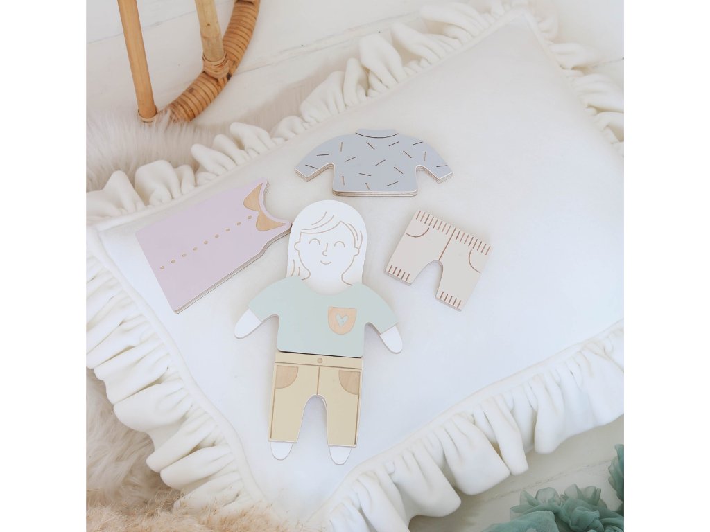 Dřevěná panenka oblékání Emma je hračka rozvíjející představivost a kreativitu. Děti si mohou Emmu oblékat do 5 různých oblečků, které lze společně kombinovat. Oblečení má zabudované magnety, aby na panence dobře drželo.
