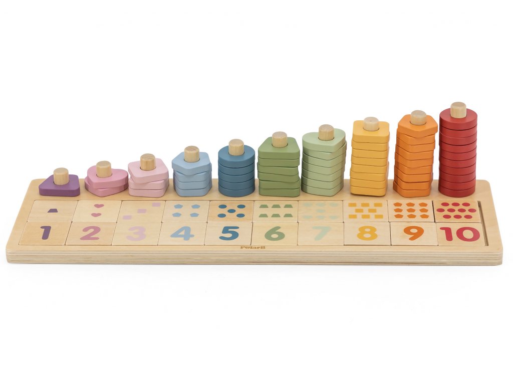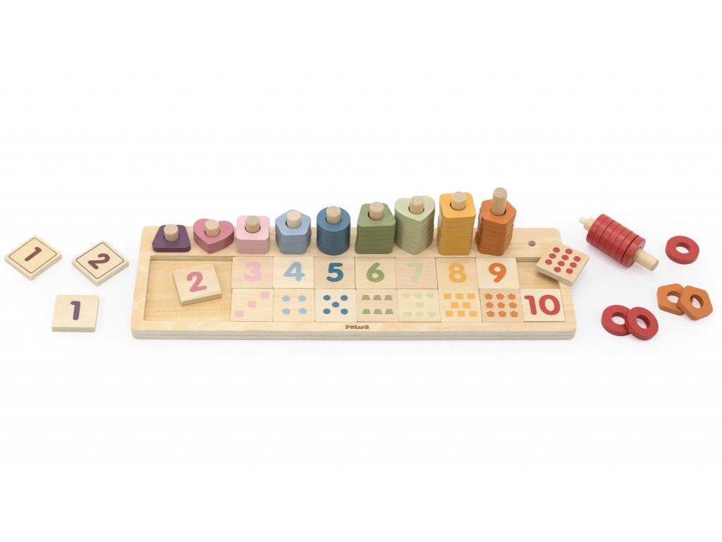 Senzorická Montessori deska je skvělým pomocníkem pro děti, které s čísly začínají. Deska se pověsí na zeď a může začít řešit matematické příklady. Vyrobeno ze dřeva.