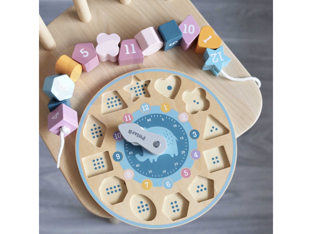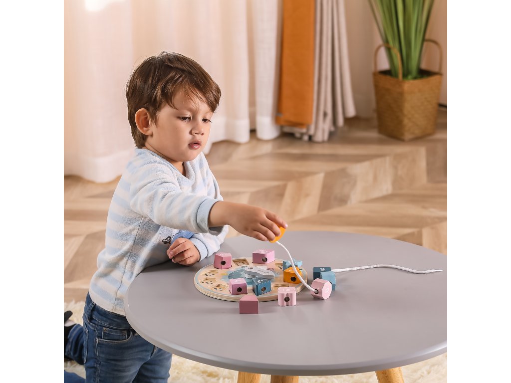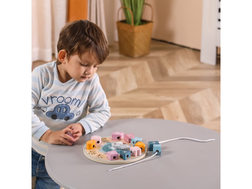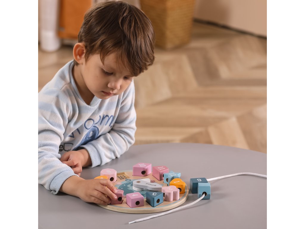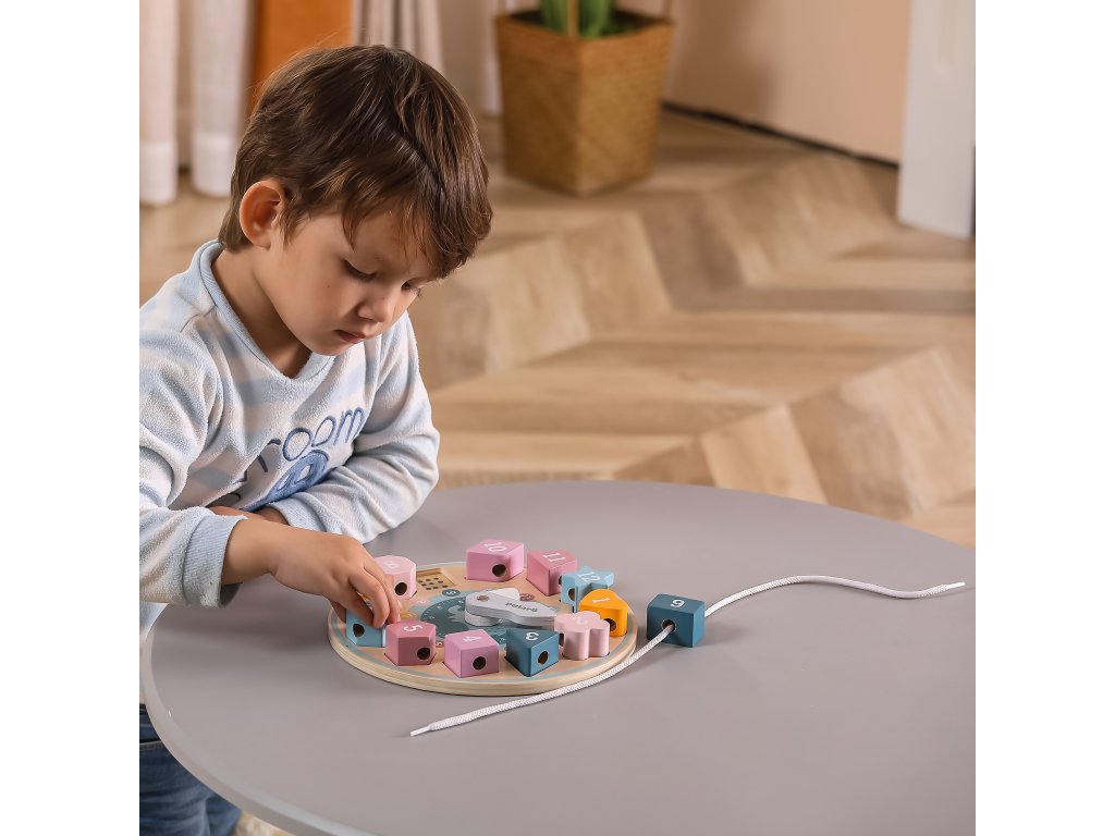 Montessori hodiny se slonem jsou hračkou, která spojuje podnikání s potěšením. Dítě snadno zvládne první krůčky v učení se číst hodiny na klasických hodinách a zároveň navlékat barevné kostky na provázek.