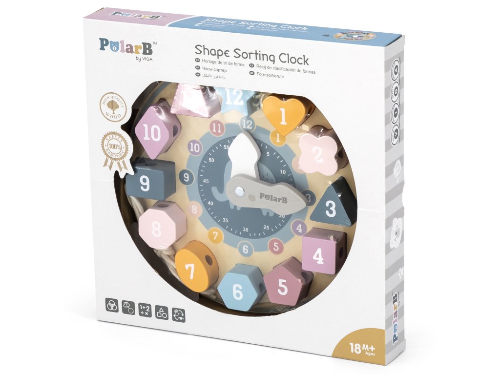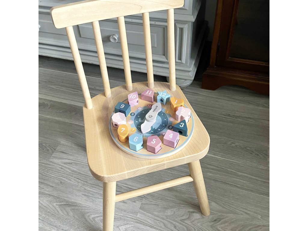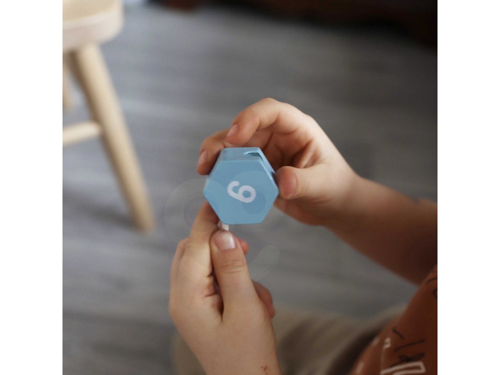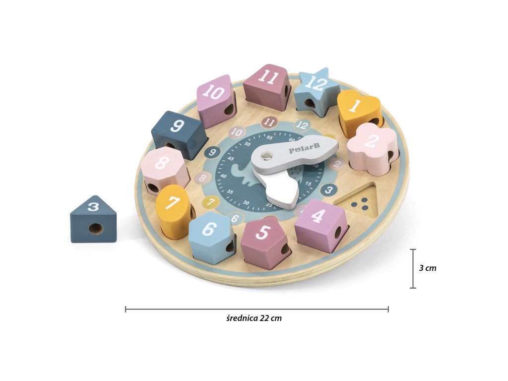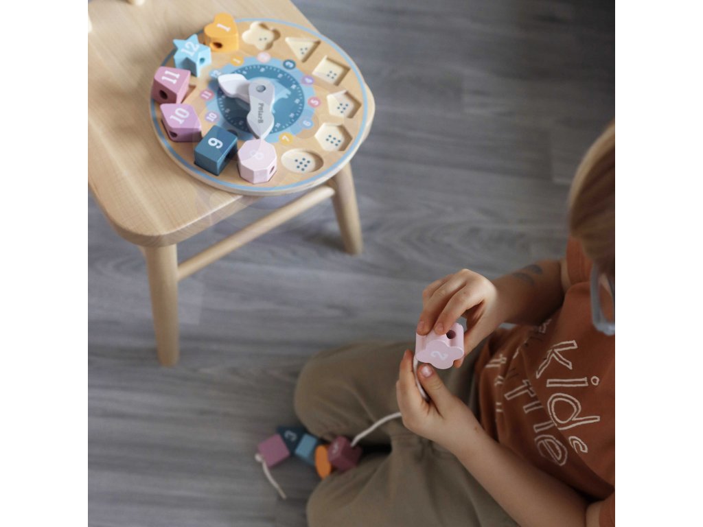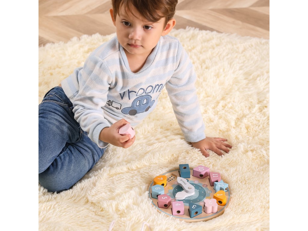 - hračka ve tvaru ciferníku má 2 pohyblivé ručičky, 12 geometrických kostek a provázek