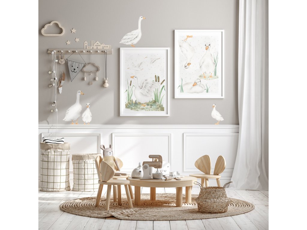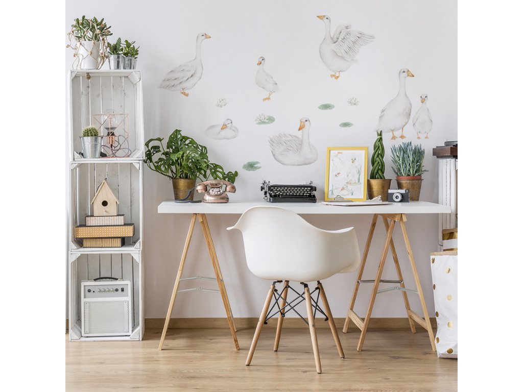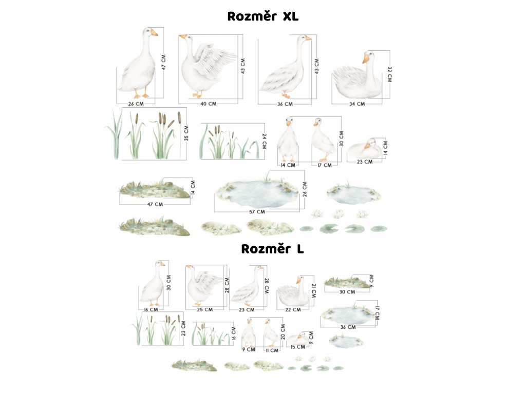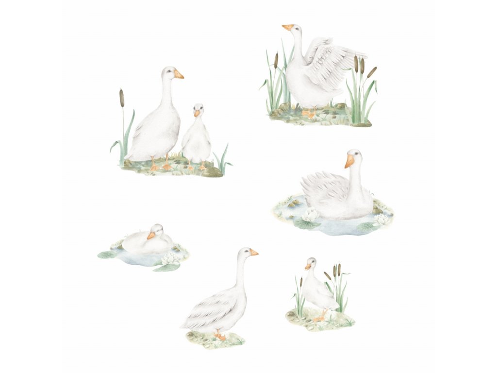 Samolepky Husy se skládá ze 7 nádherných hus a různých rostlinných prvků, jako jsou vodní trávy a lekníny. Decentní barvy samolepek krásně obohatí každý interiér. Celkem obsahuje 28 prvků.