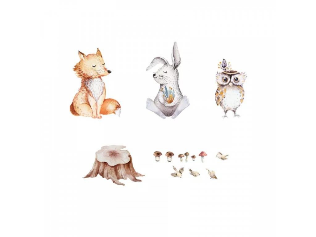 Potištěné samolepky na zeď vyřezané z matné fólie s motivem lesa. Samolepka na zeď do dětského pokoje s liškou, zajícem a sovou v neutrálních barvách. Sada obsahuje také pařez a mix lesních prvků pro vlastní aranžmá.