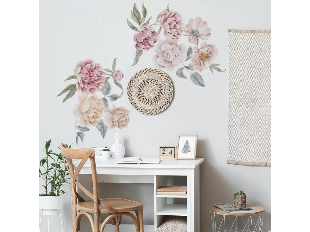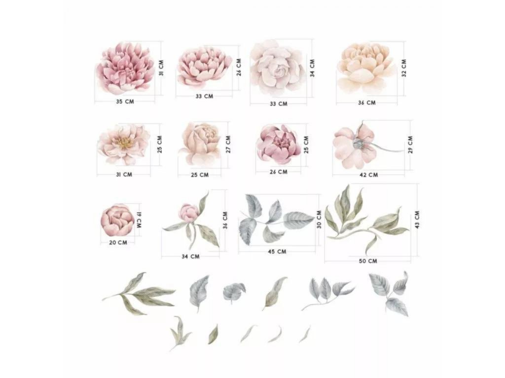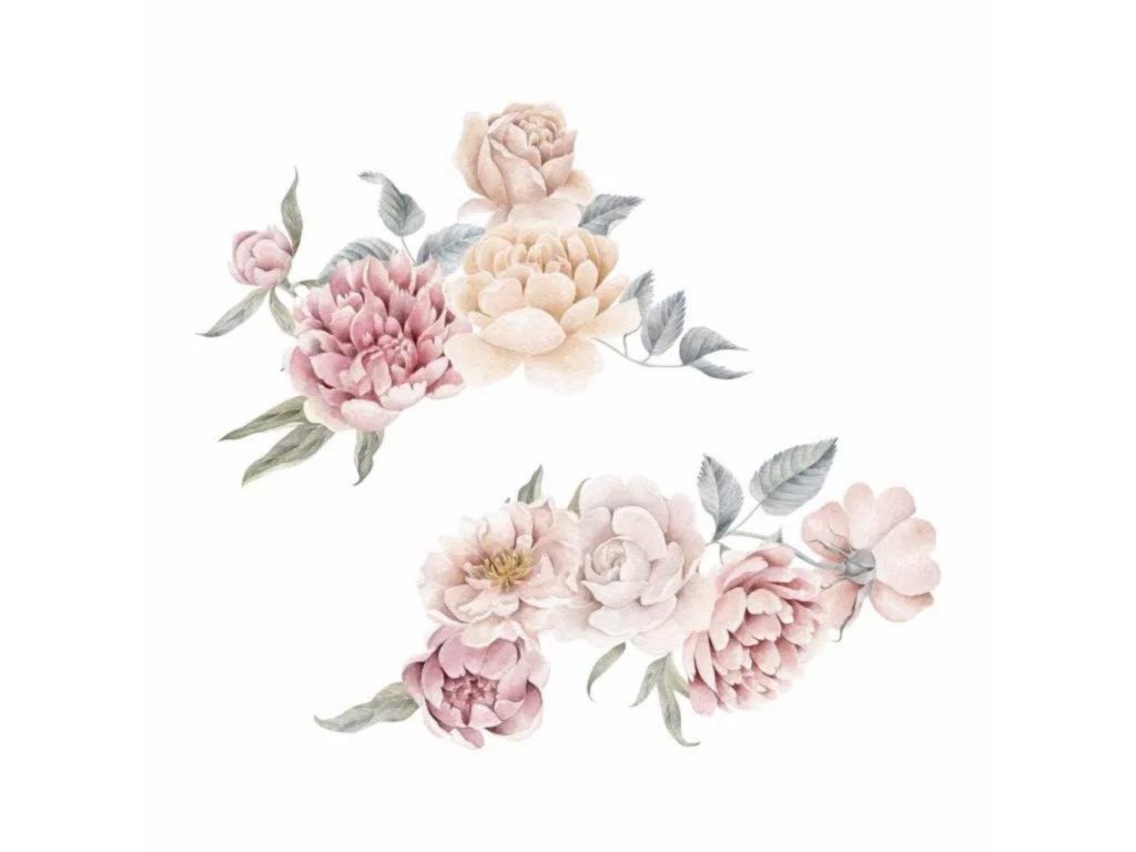 Sada tištěných samolepek na zeď vyřezaných z matné fólie s motivem nádherných malých pivoněk a růží se budou vyjímat v dětském pokojíčku pro holčičky, ale i dalších místností v bytě jako ja například pracovna, obývací pokoj, kuchyň nebo ložnice