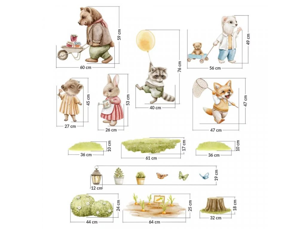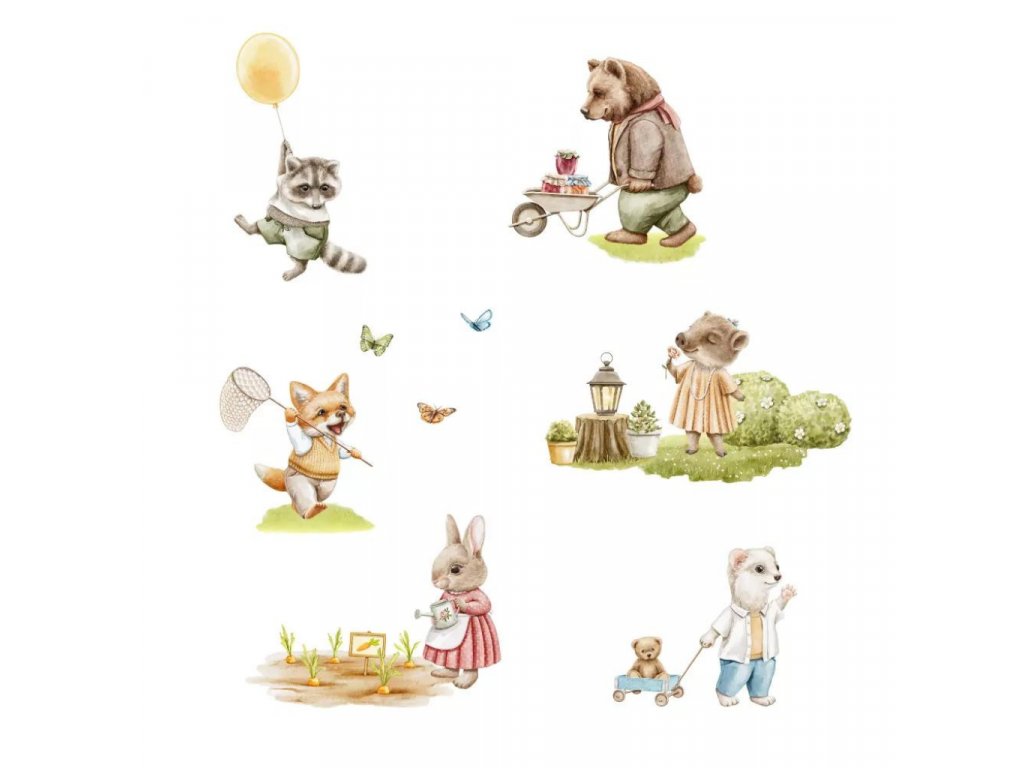 Poznejte naše pohádková zvířátka ze samolepky! Paní Králíčková Basi má v hlavě jen mrkev. Dnes, oblečená jako obvykle, zalévá svoje oblíbené mrkvičky a těší se, až z nich vypěstuje vynikající oranžové plody. Rozpustilý lišák Felix chytá motýly do síťky a mýval Šimon ho seshora sleduje. Lasička na ně zatím mává. Medvěd Míša je zaneprázdněný a těší se až si někde v klidu sní svoji sladkou dobrotu.