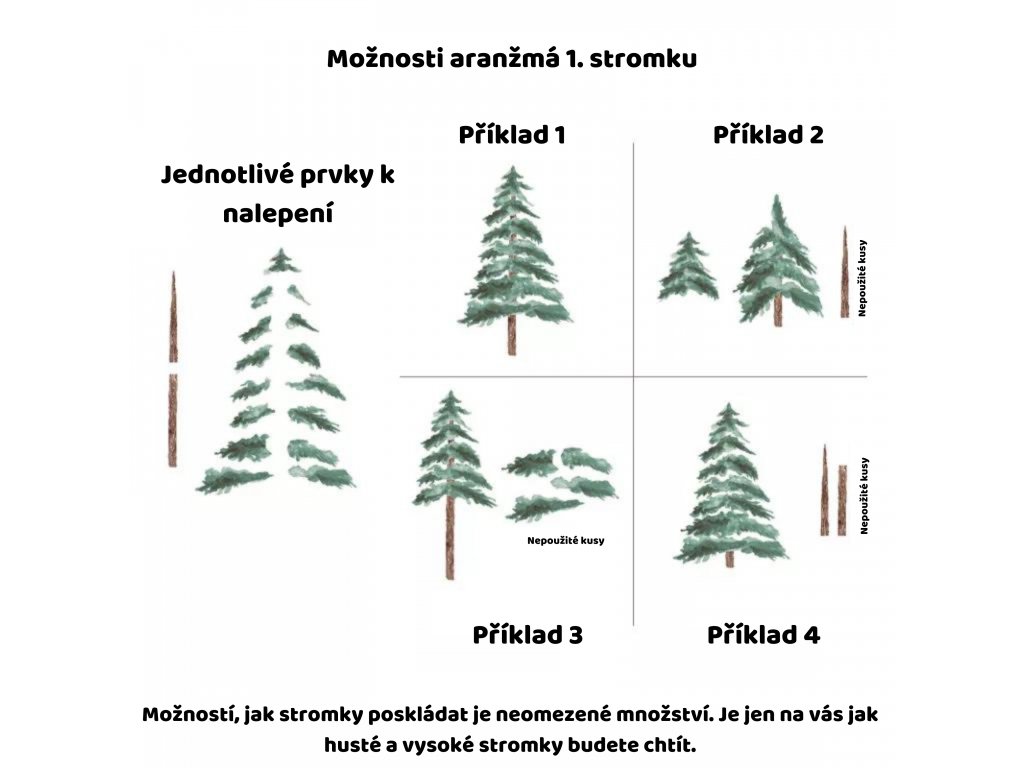 Sada obsahuje 2 ks na stěnu stromků. V balení obdržíte kmen a větve samostatně a můžete si je tak nalepit dle vlastního vkusu. Aby stromy vypadaly ještě lépe, přidali jsme do sady paseky, trsy trávy a houby, čímž získáte nekonečné možnosti uspořádání.