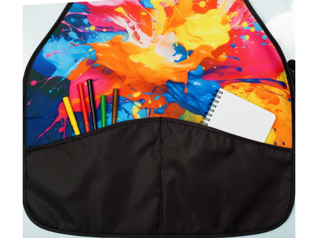 Zástěrka na výtvarnou výchovu se navléká nastavitelným popruhem přes hlavu a zaváže se kolem těla pomocí šňůrek.Je vyrobena z omyvatelného polyesterového materiálu, který se lehce udržuje.