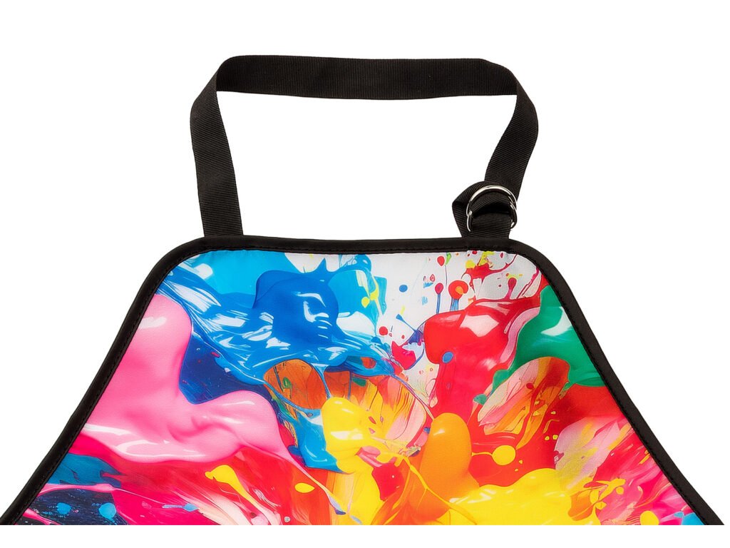Hlavní část zástěrky je potištěna obrázky ve školních designech, ladících ke školní kolekci.