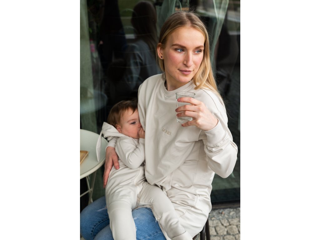 Dlouhá mikina má unikátní střih, který umožní decentní kojení kdykoli bude miminko potřebovat. Na první pohled však není poznat, že se jedná o kojící mikinu!